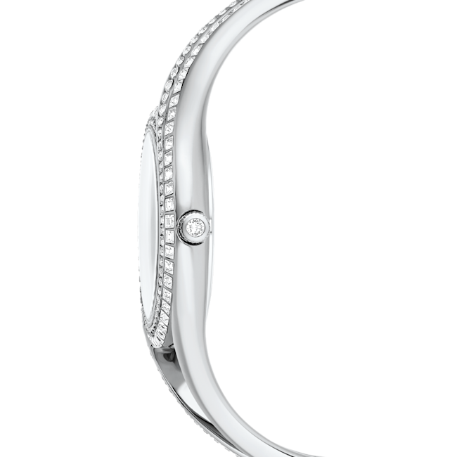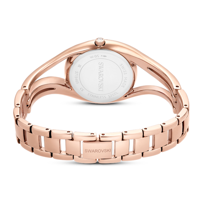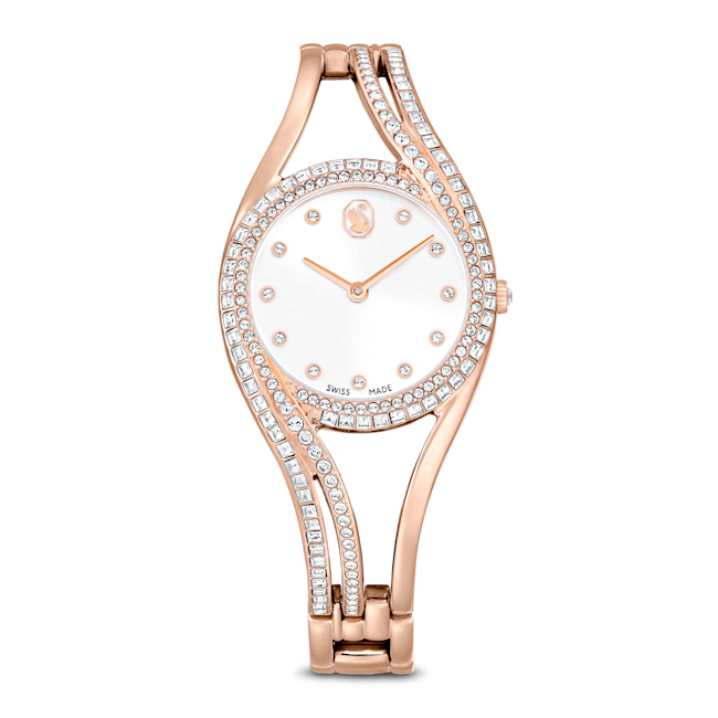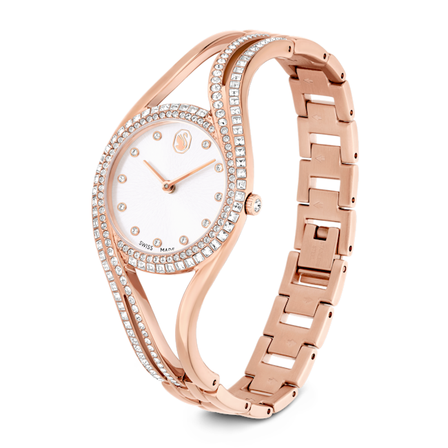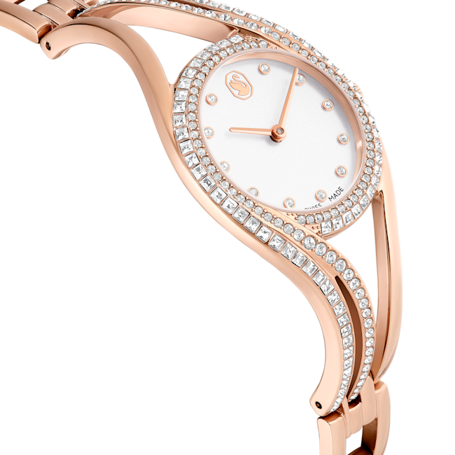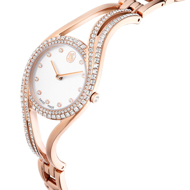 The Swarovski Hyperbola Bangle Watch Swiss Made Metal Bracelet is a striking fusion of jewelry artistry and watchmaking excellence, characterized by its elegant curves and sophisticated flair. This remarkable piece features a 28mm stainless steel case adorned in a luxurious rose gold-tone finish, seamlessly merging the bezel with the bracelet and beautifully encrusted with 176 clear crystals in both princess and round cuts. The captivating sunray dial enhances its allure, showcasing 11 crystal hour markers and the iconic Swarovski Swan logo at the 12 o’clock position. Adding to its refined detailing, a single crystal is delicately set into the crown, while a water resistance of up to 50 meters assures practicality alongside its visual appeal. Swiss Made with meticulous craftsmanship, the Hyperbola bangle watch is a testament to modern elegance, effortlessly blurring the boundary between fine jewelry and precision timepieces, and making it an exquisite choice for those with discerning taste.