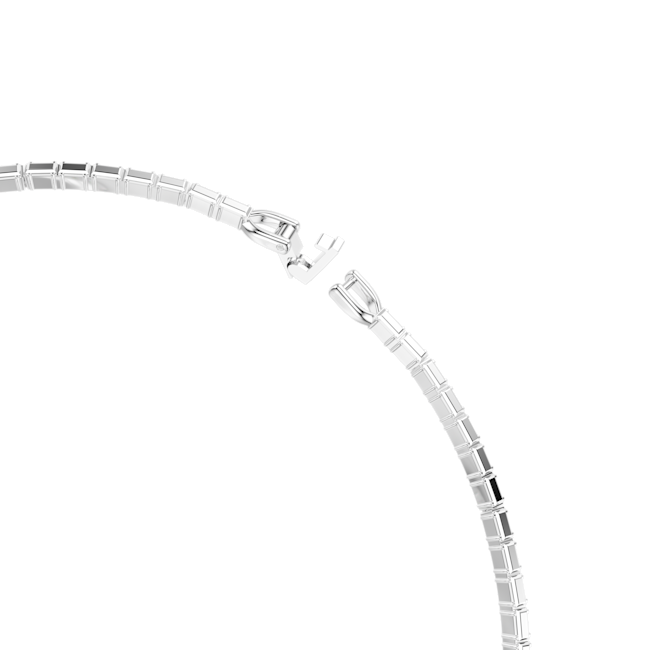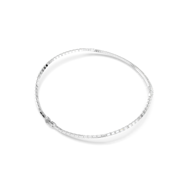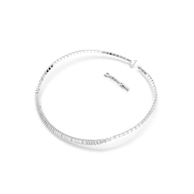 The Swarovski Matrix Necklace Baguette Cut White Rhodium Plated is a dazzling piece designed to embody timeless elegance and luxurious sophistication. Featuring an all-around design, this necklace is meticulously adorned with baguette-cut Swarovski Zirconia, each securely set in prongs to maximize their radiant sparkle. The rhodium plating enhances the brilliance of the stones, lending a refined and modern touch. Practical as well as beautiful, the necklace is fitted with a convenient foldover clasp and an adjustable extender for a perfect fit. Its scintillating design makes it a standout accessory on its own, but it can also be paired with matching Matrix hoop earrings to further elevate your ensemble, creating a coordinated and impactful look for any occasion.