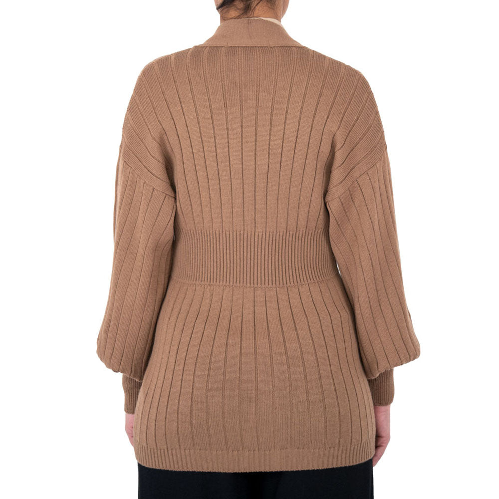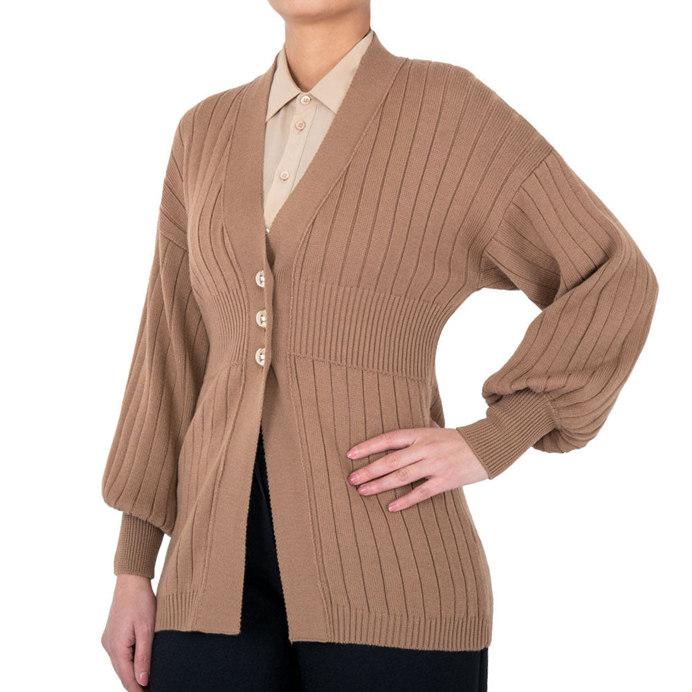 Brown long sleeves knit cardigan. Y-Neck collar and three button for closure.