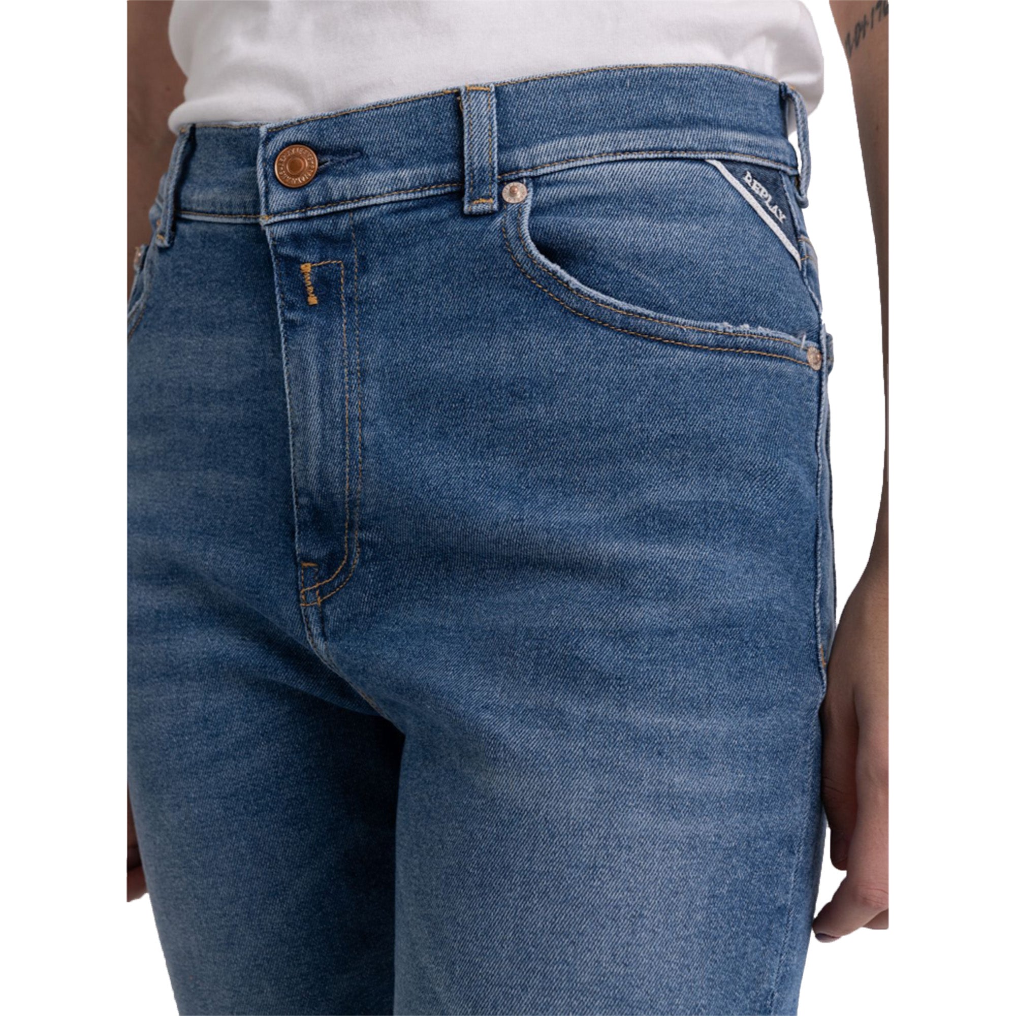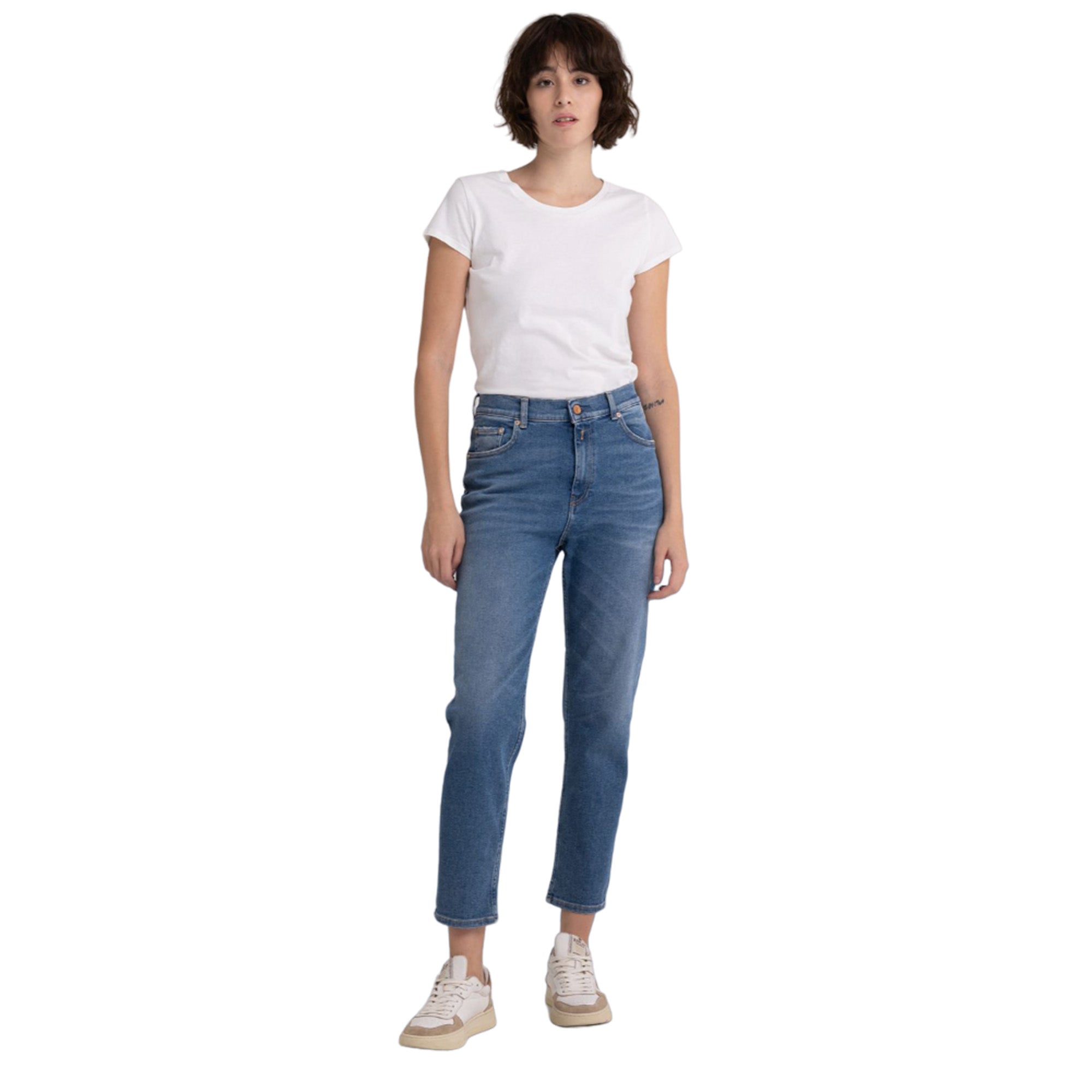 High-waisted tapered fit jeans with tapered leg. With a vintage touch, the garment is made of 12 oz blue indigo super stretch cotton denim with a stonewashed medium dark wash tone with a vintage look. The five pocket item is characterized by the whisker treatment and scrapings on used areas. Zip and button fly.