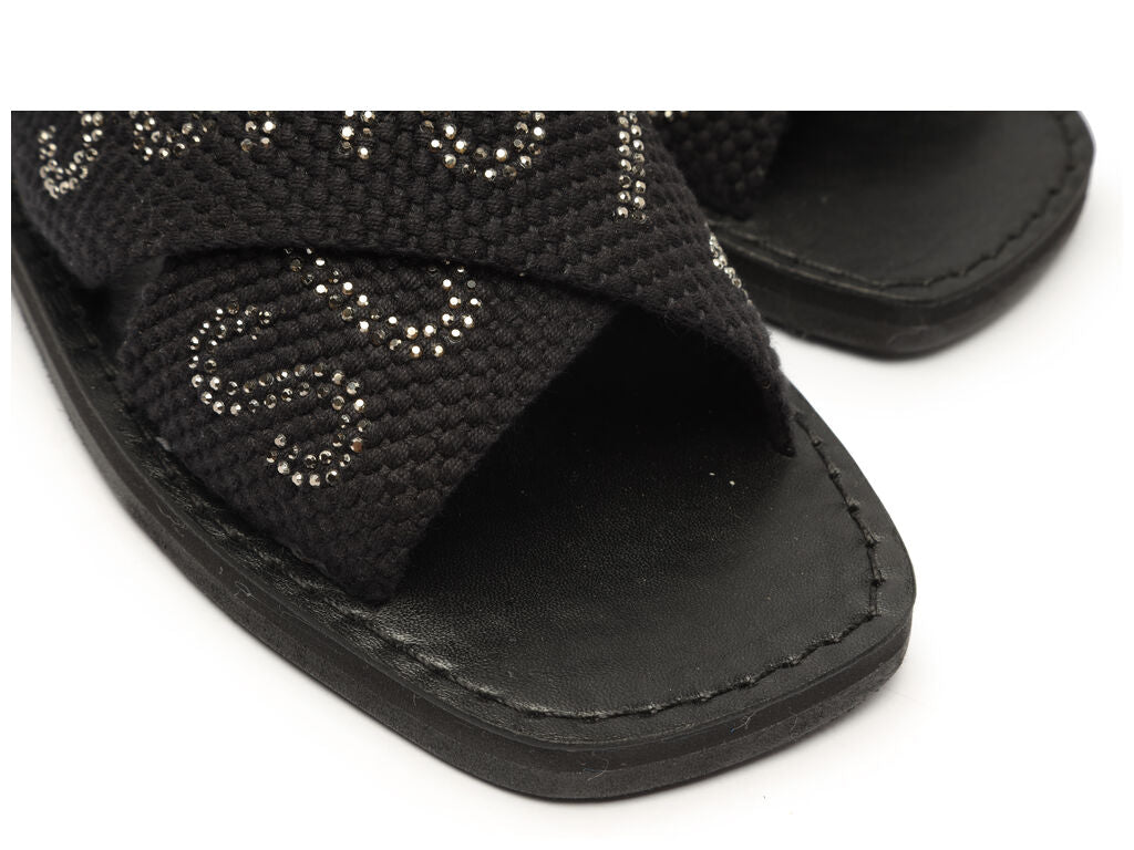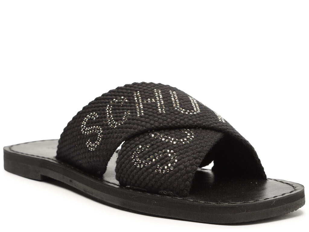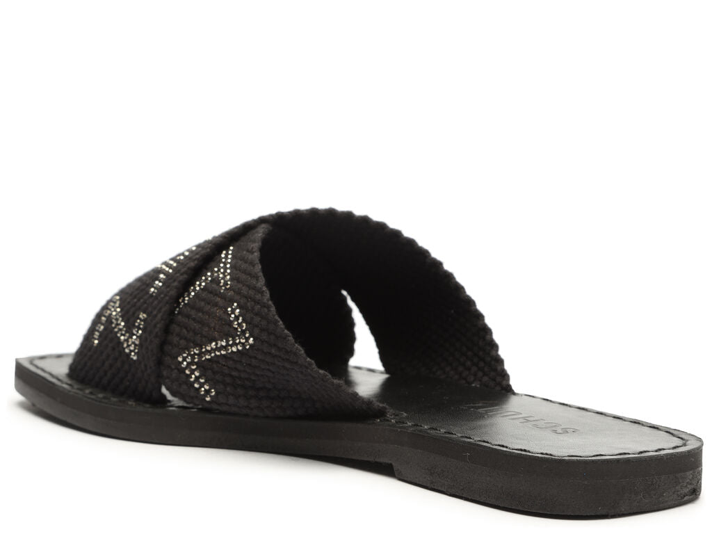This black flat sandal features wide, criss-cross canvas straps embellished with glittering crystals forming the SCHUTZ name, offering a chic, statement look for warm weather.
