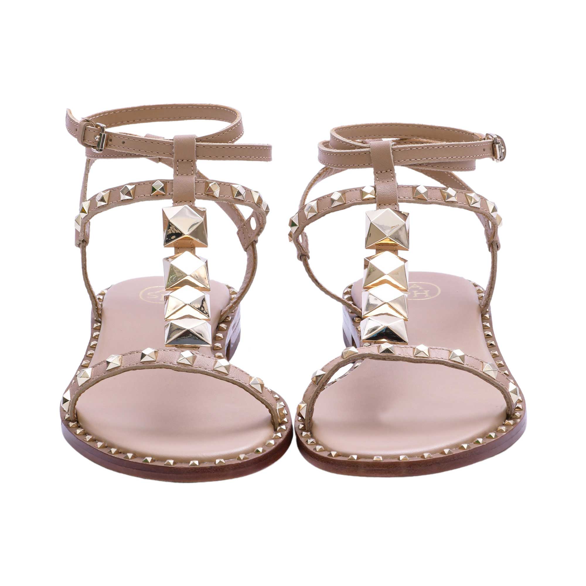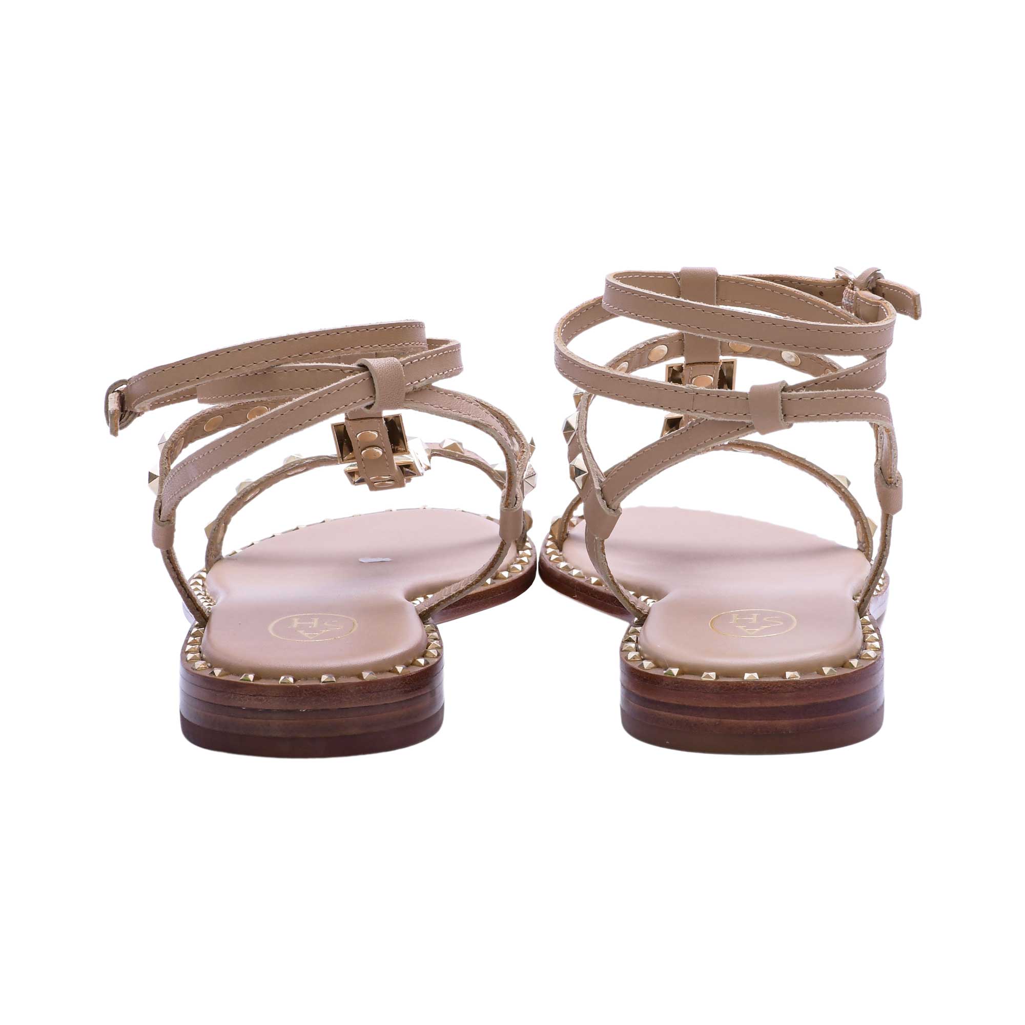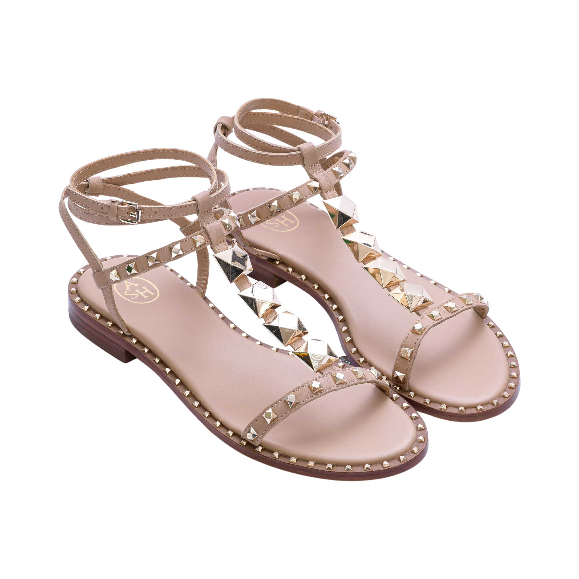 The ASH Women's Brasil Skin/Ariel Sandal is a stylish and versatile footwear option. Designed in sand beige using premium calf leather, these sandals feature intricate gold-tone stud detailing that adds a touch of glamour. The open toe design keeps your feet cool and comfortable, while the buckle-fastening ankle strap provides a secure fit. The branded footbed adds a unique touch, while the flat sole ensures comfort for all-day wear. The combination of high-quality materials and fashionable design makes these sandals a must-have in any wardrobe. They can be dressed up or down, making them a perfect choice for any occasion. SPECIFICATIONS