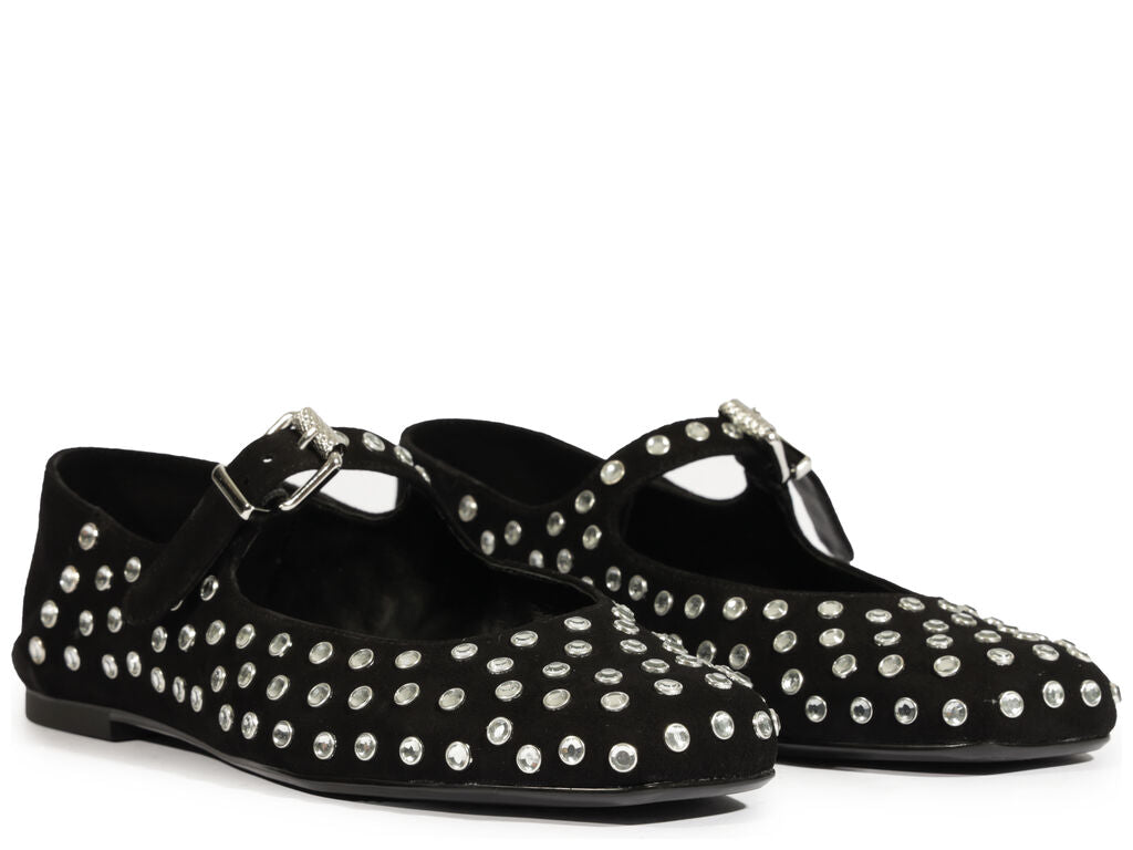 Crafted in soft black suede, this Mary Jane style is completely covered in shimmering crystals, offering glamorous comfort for all-day or evening wear.