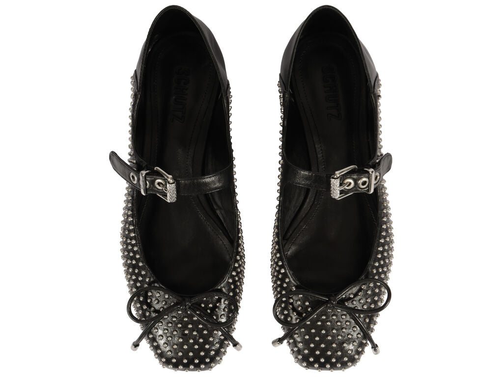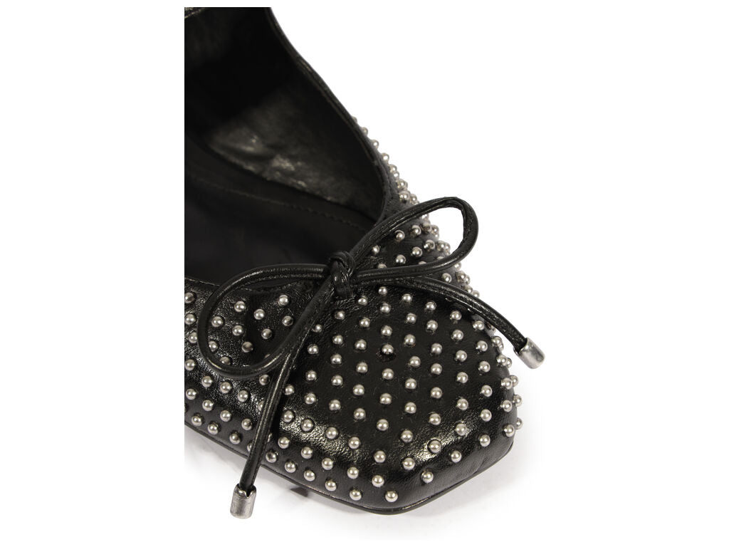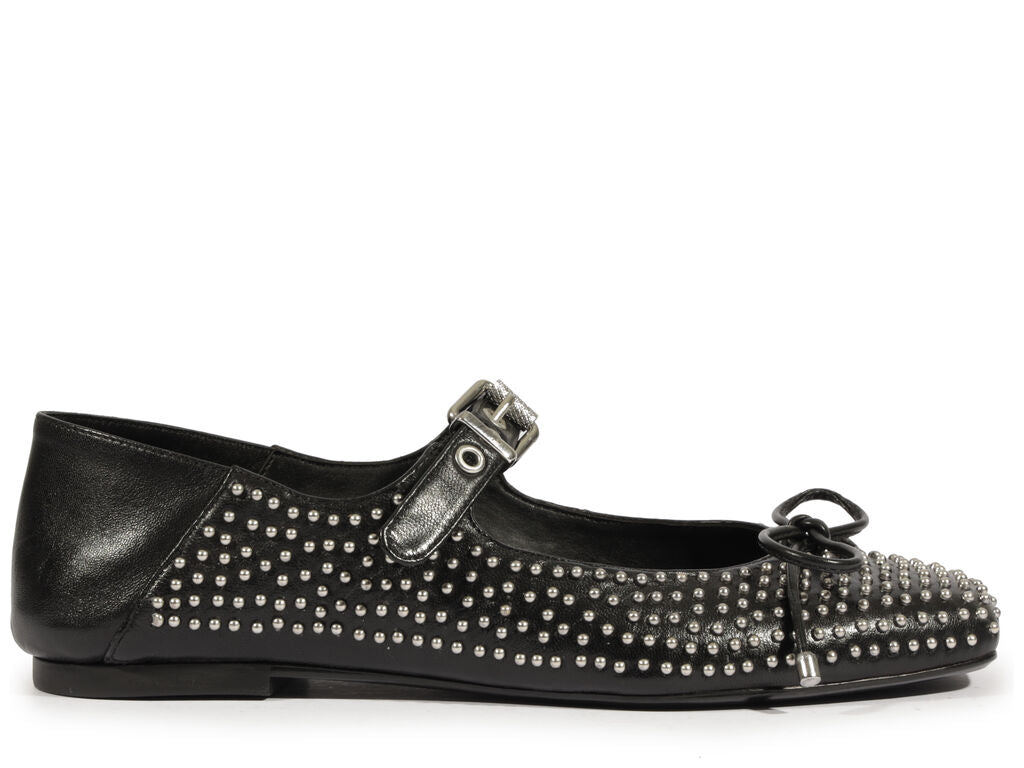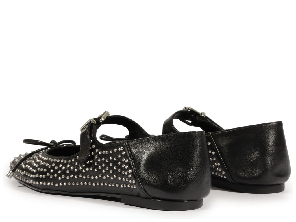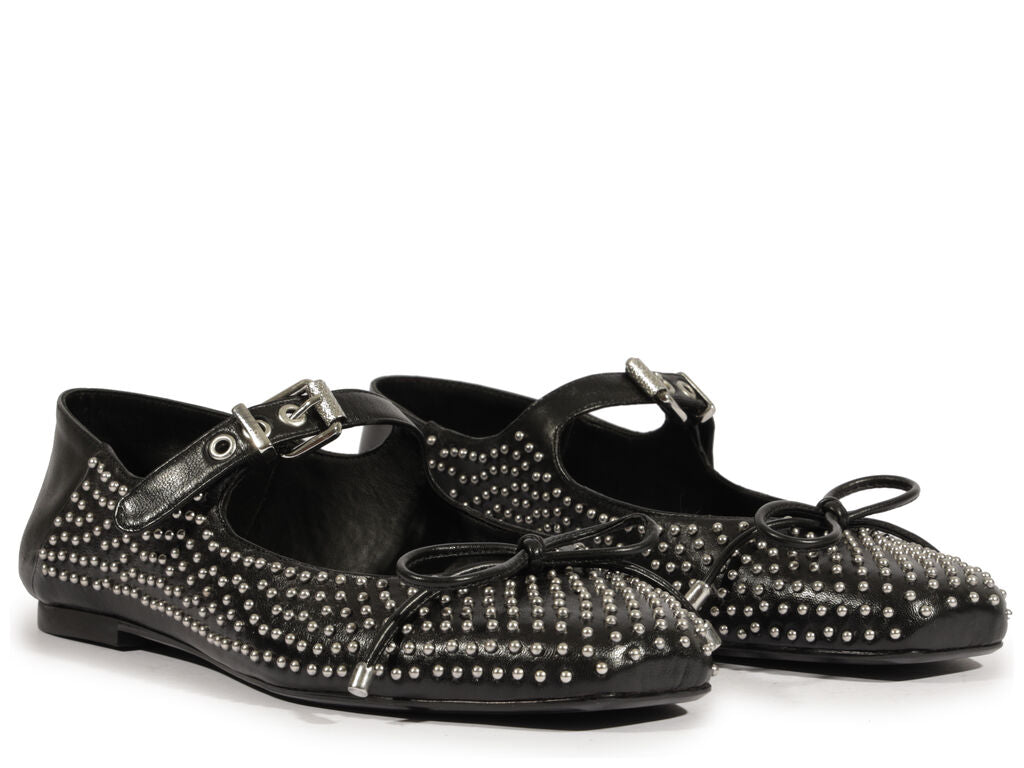 This classic flat silhouette is radically updated with all-over silver-toned studs, a bold buckle strap, and a delicate bow detail, creating a powerful statement shoe that is both feminine and edgy.