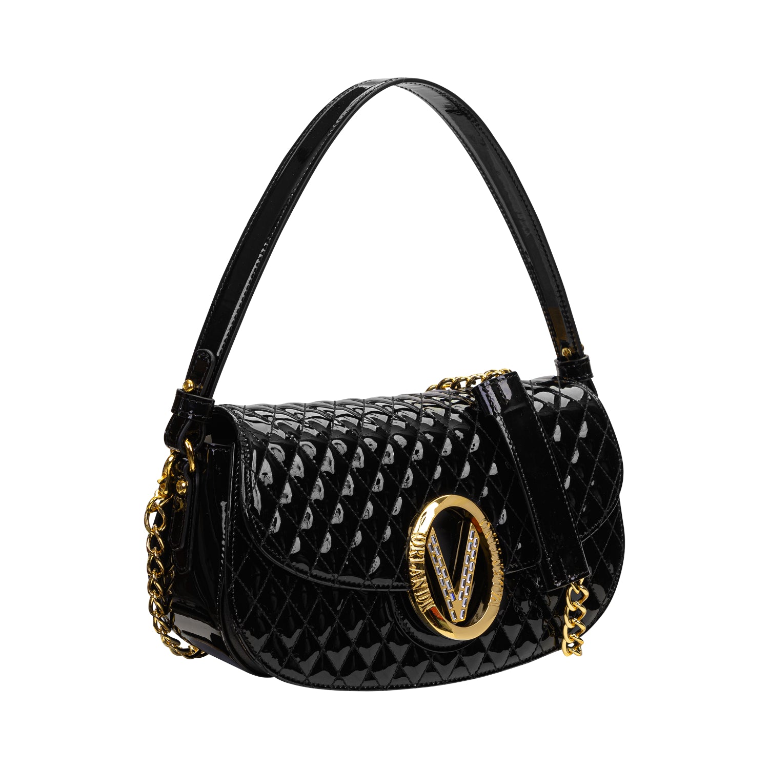 Elevate your style with this glamorous ORLANDI VALENTINO Quilted Patent Leather Shoulder Bag. This handbag is a true statement piece, showcasing the brand's dedication to high-shine elegance and sophisticated design, perfect for the discerning woman in Doha. Crafted from luxurious black quilted patent leather, it features a captivating diamond-quilted pattern that catches the light beautifully. The iconic ORLANDI VALENTINO gold-tone logo plaque at the front serves as a signature detail. The sleek, curved silhouette is complemented by a comfortable shoulder strap, making it ideal for both daytime sophistication and evening glamour in Doha's vibrant social scene. The compact, lined interior includes pockets to keep your essentials organized, ensuring you're always prepared for any occasion.