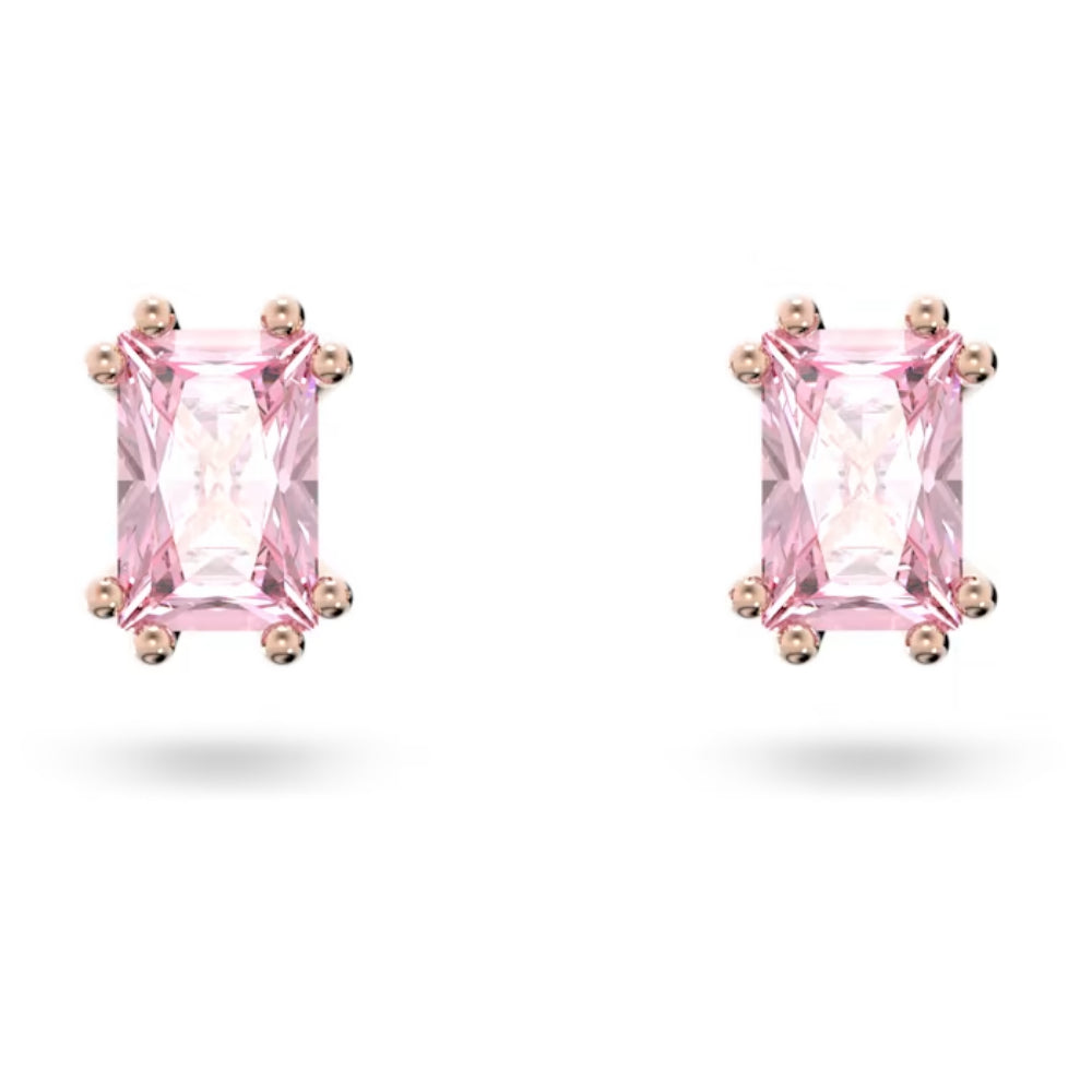 | These stud earrings are part of the Stilla family and can be combined with any of the other pieces in the collection to create an almost infinite number of different looks. These pink rectangular-cut stones are set in settings that have a rose gold-tone plating, and the way you decide to wear them is a big part of the fun. SPECIFICATION :