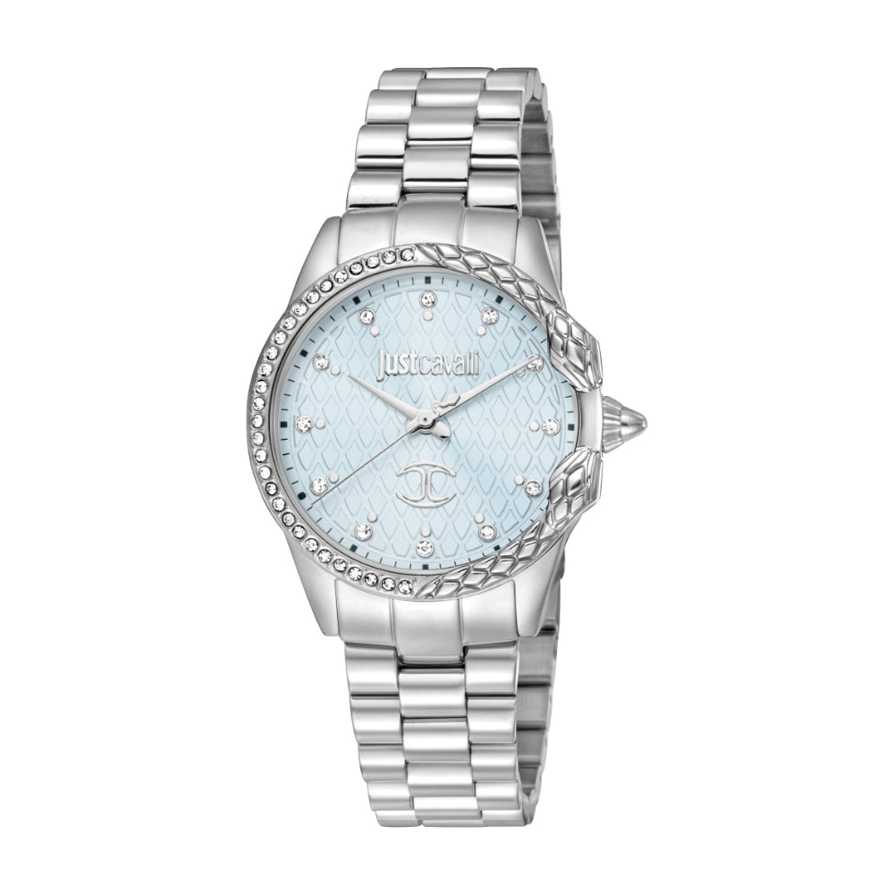 Just Cavalli Women's Watch, Silver Color Case, Light Blue Dial, Stainless Steel Metal Bracelet