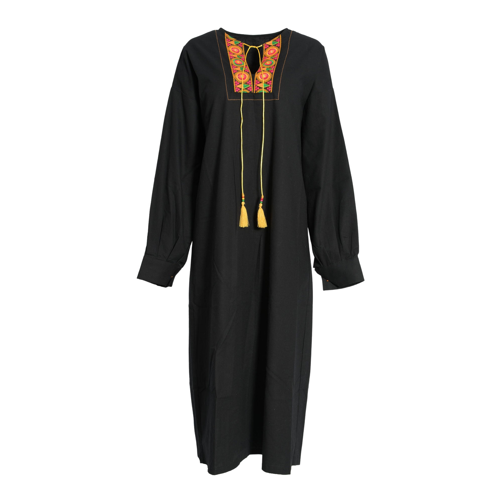 The Fahm Women's Black Dress is a stunning piece that is sure to make a statement. This free-size dress features a round neck with a slit, and is adorned with multicolor embroidery with drawstring and tassels. It is made with a fine fabric. The long,cuff sleeves make it perfect for any season, and add to its overall charm. This dress is sure to turn heads and make you feel beautiful. Whether you wear it to a special occasion or just to look your best, this dress is sure to make you feel like a million bucks. SPECIFICATIONS: