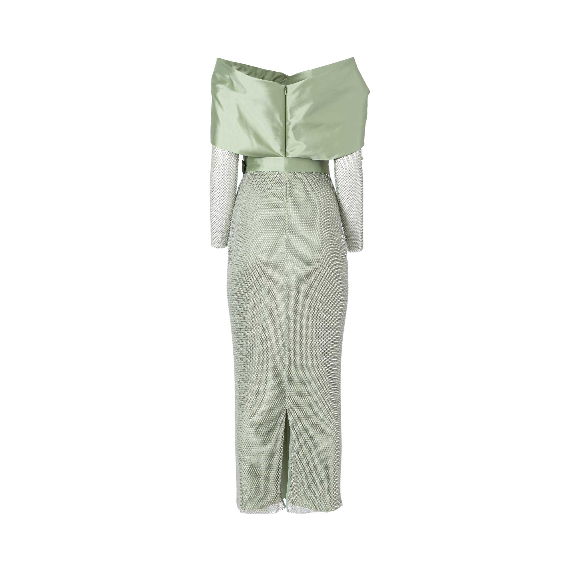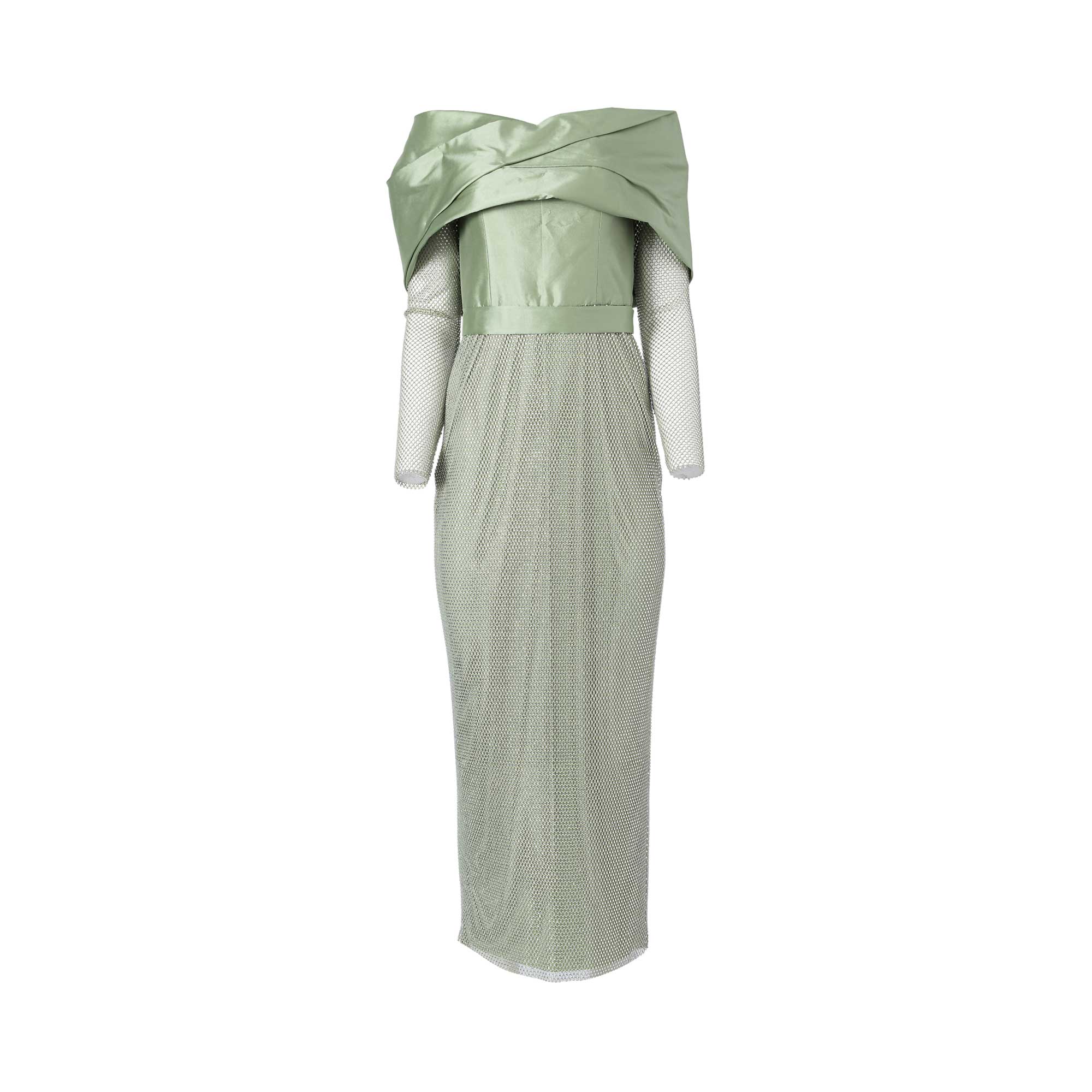 The Velvety Couture LaLa Women's Mint-green Dress is a stunning piece that exudes elegance and sophistication. The dress features a pencil cut, which accentuates the curves of the body for a flattering silhouette. The top of the dress is made from gathered tafta, giving it a luxurious and velvety texture. The skirt, on the other hand, is made from delicate net fabric and adorned with beautiful stones for a touch of glamour. To cinch in the waist and add a touch of Indian influence, the dress comes with a belt made from Indian silk. This adds a pop of color and also helps to define the waistline. The dress also features long net sleeves with intricate stone detailing, adding a hint of drama and intricacy to the overall look. The dress features a wrapped off-shoulder design, which adds a touch of femininity and romance to the dress. It also adds a modern twist to the traditional midi dress, making it perfect for various occasions, from formal events to cocktail parties. With its stunning design and attention to detail, the Velvety Couture LaLa Women's Mint-green Dress is a must-have for any fashion-forward woman. SPECIFICATIONS