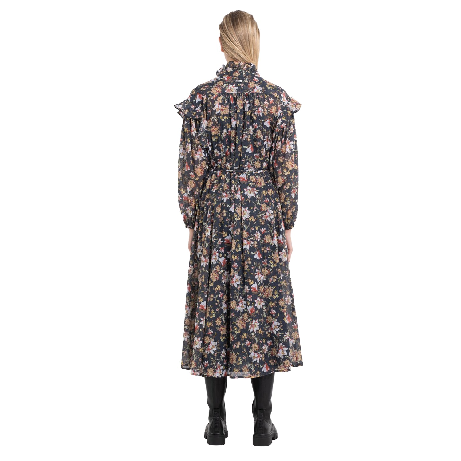 Long dress in muslin cotton with all-over floral print. The garment is characterized by the elbow-length puffed sleeves and by the side-crossed V-neck. The item is refined by the ruffles on the edges. Viscose inner lining. Atelier stands for a new way of wearing denim, with a refined and contemporary collection with clean-cut and feminine items that stand the test of time, season after season. The core Replay fabrics relieve in this collection with a mix of contrasts that ensure perfect wear ability and a unique style.