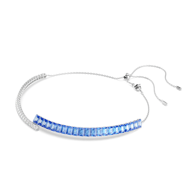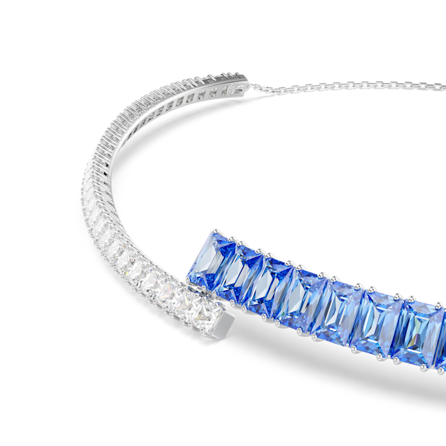 The Swarovski Matrix Choker Mixed Cuts Blue Rhodium Plated is a striking statement piece, perfect for those who love to showcase vibrant and colorful style. This elegantly crafted choker features a sleek rhodium-plated band, artistically overlapped at the front and adorned with dazzling clear and blue Swarovski Zirconia. The mixture of round and baguette cuts creates fascinating reflections and depth, adding a contemporary twist to classic sparkle. The choker is conveniently secured with a lobster closure and includes a sliding mechanism, allowing for an adjustable and comfortable fit. This piece effortlessly draws attention, especially when paired with coordinating bracelets or earrings, making it ideal for both special occasions and elevating everyday outfits.