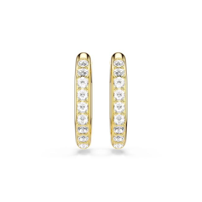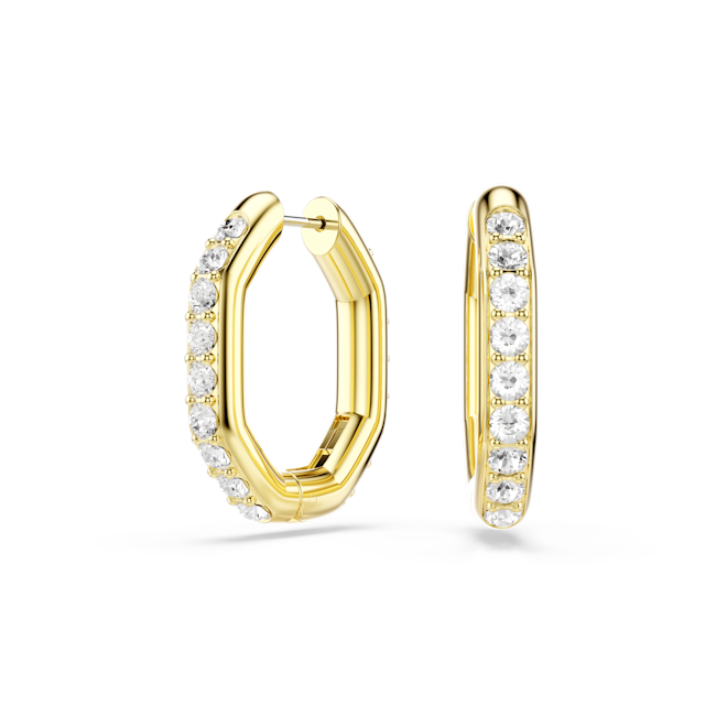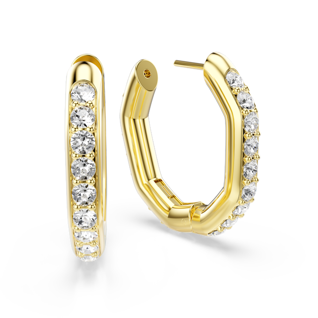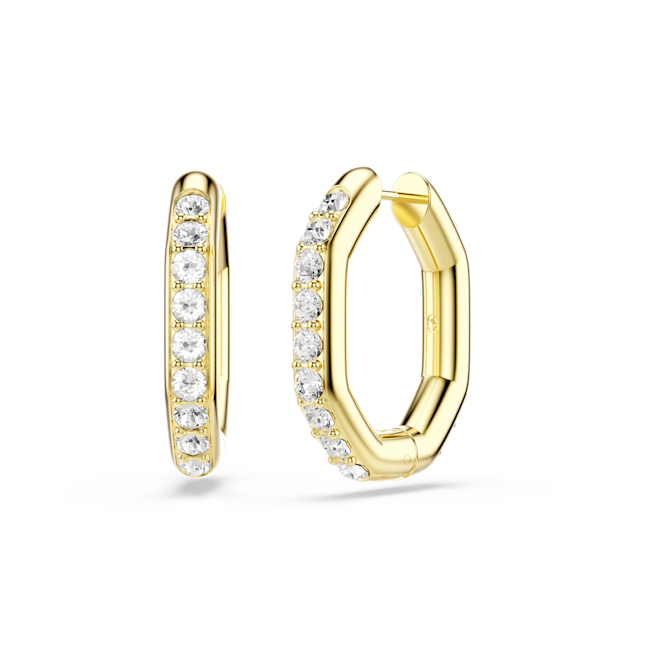 The Swarovski Dextera Hoop Earrings Octagon Shape Round Cut Medium White Gold-Tone Plated combine geometric modernity with timeless elegance, making them an exceptional statement accessory. Featuring a slender octagonal silhouette, these hoop earrings stand out with their bold architectural lines, offering a sleek and contemporary frame for the dazzling embellishments. Each earring showcases a single row of brilliant clear round-cut crystals meticulously placed in delicate prong settings, allowing the stones to catch and reflect light from every angle. The practical spring plate mechanism ensures the earrings are easy to open and close, providing both convenience and security for day-to-evening wear. Finished with a sophisticated gold-tone plating, this versatile pair is ideal to mix and match with other pieces from the Dextera collection, adding a touch of glamour and refined style to any look.