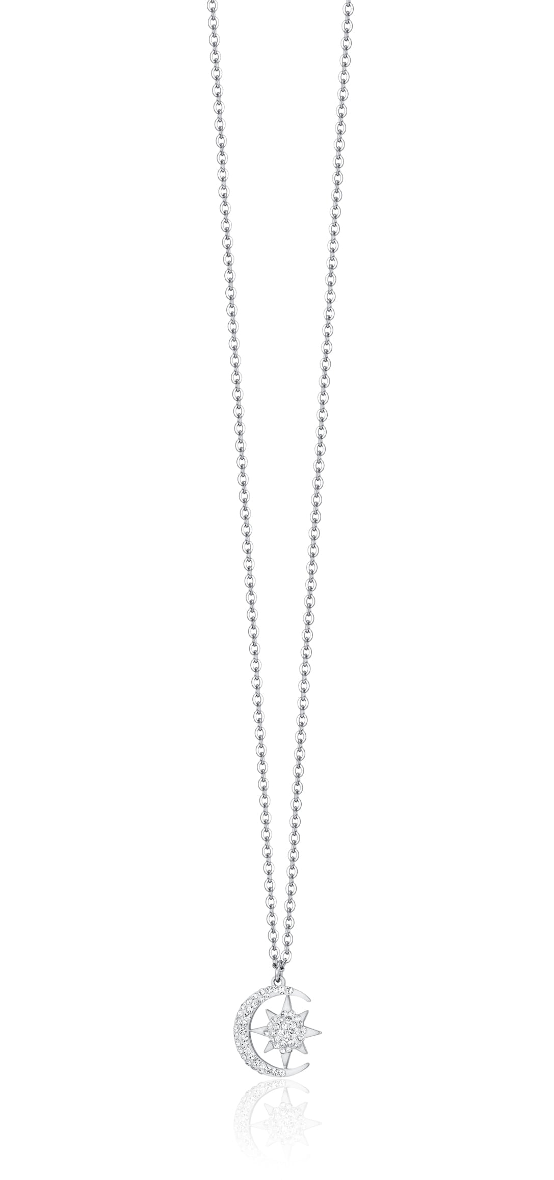 • The Luca Barra Ladies Steel Star and Moon Necklace with White Crystals is an elegant and charming jewelry piece.