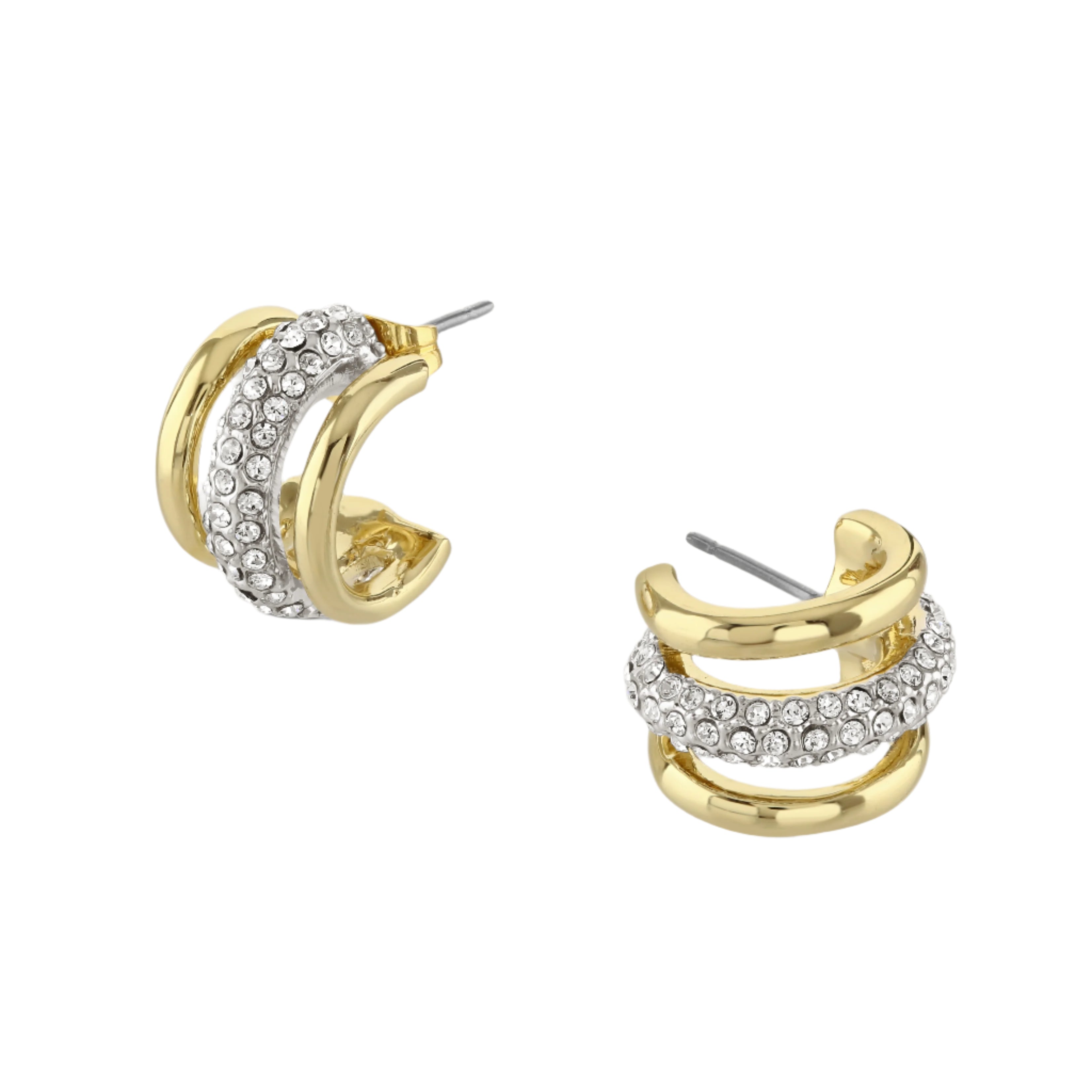 The Buckley London Aspire Earrings in mixed metals beautifully combine shimmering pavé-set crystals with a sophisticated design. These elegant earrings showcase sparkling crystals meticulously embedded in lustrous rhodium plating, which is artfully wrapped between two sleek bands of polished gold plating. The contrasting metals create a striking and harmonious balance, adding depth and visual interest to the piece. Perfect for both special occasions and elevating everyday outfits, the Aspire Earrings exude timeless elegance and versatile charm, making them a standout addition to any jewelry collection.