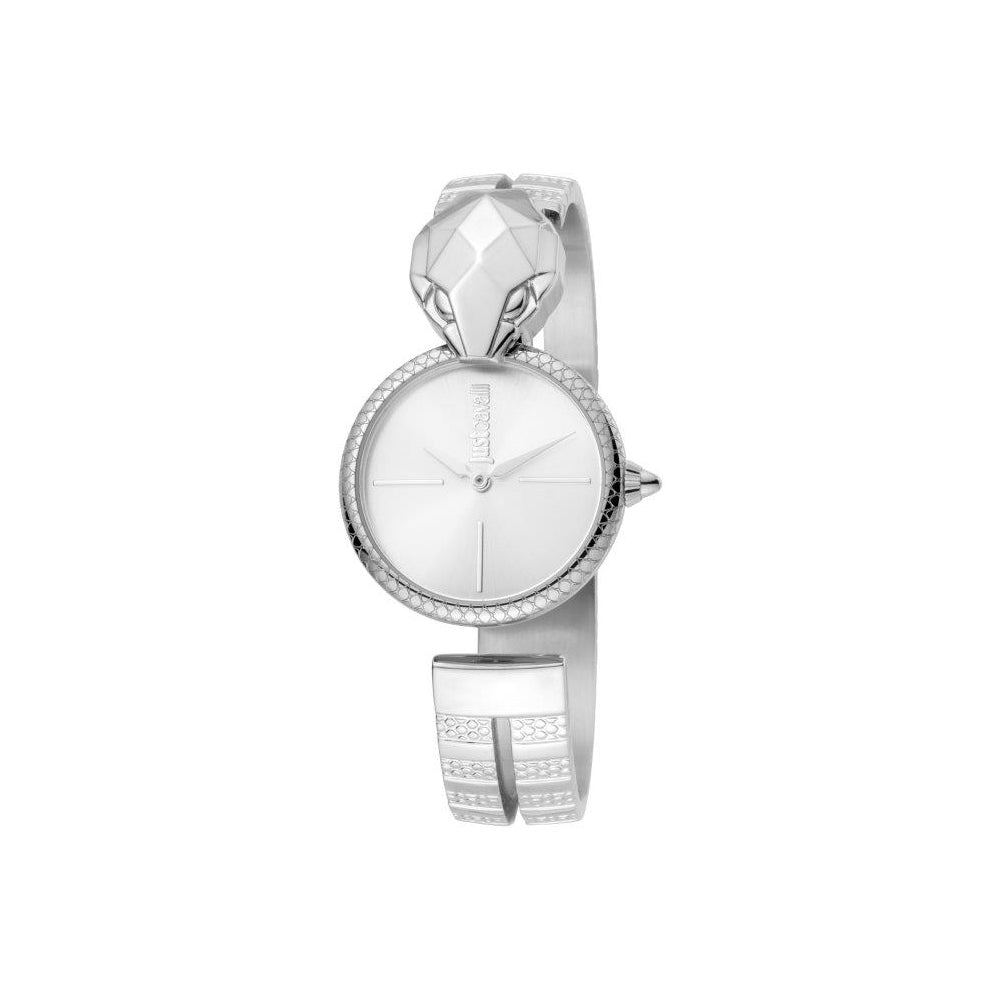ساعة جست كافالي نسائية بعلبة فضية اللون يعلوها رأس ثعبان مع سوار فضي مفتوح