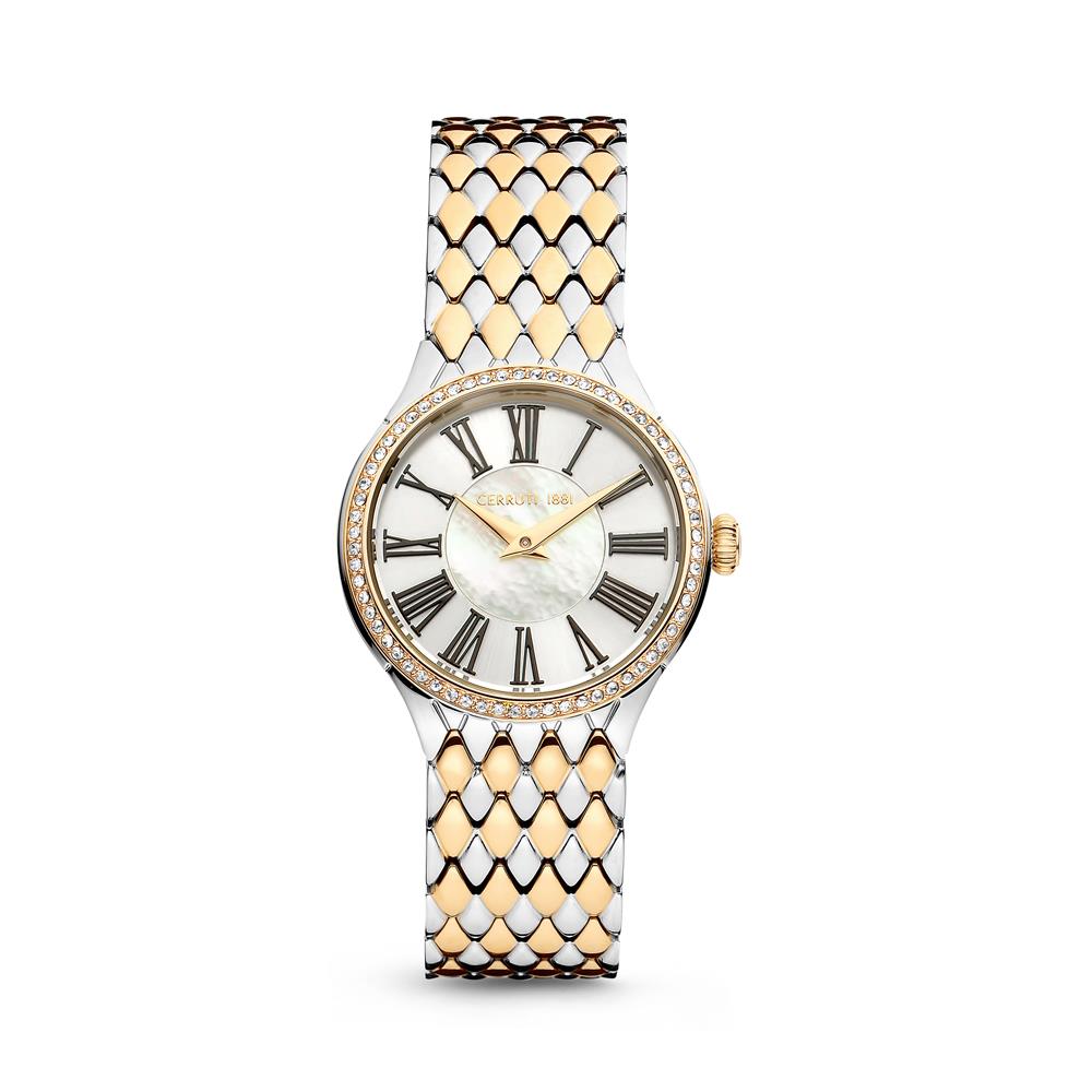 ساعة شيروتي نسائية ذات هيكل من الستانلس ستيل بلون ذهبي مرصع بالكريستال مع مينا فضية من اللؤلؤ وسوار معدني ذهبي اللون