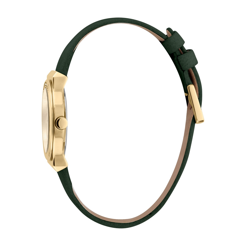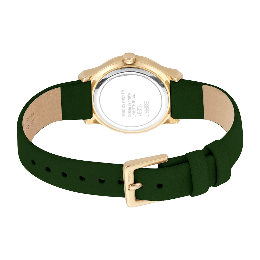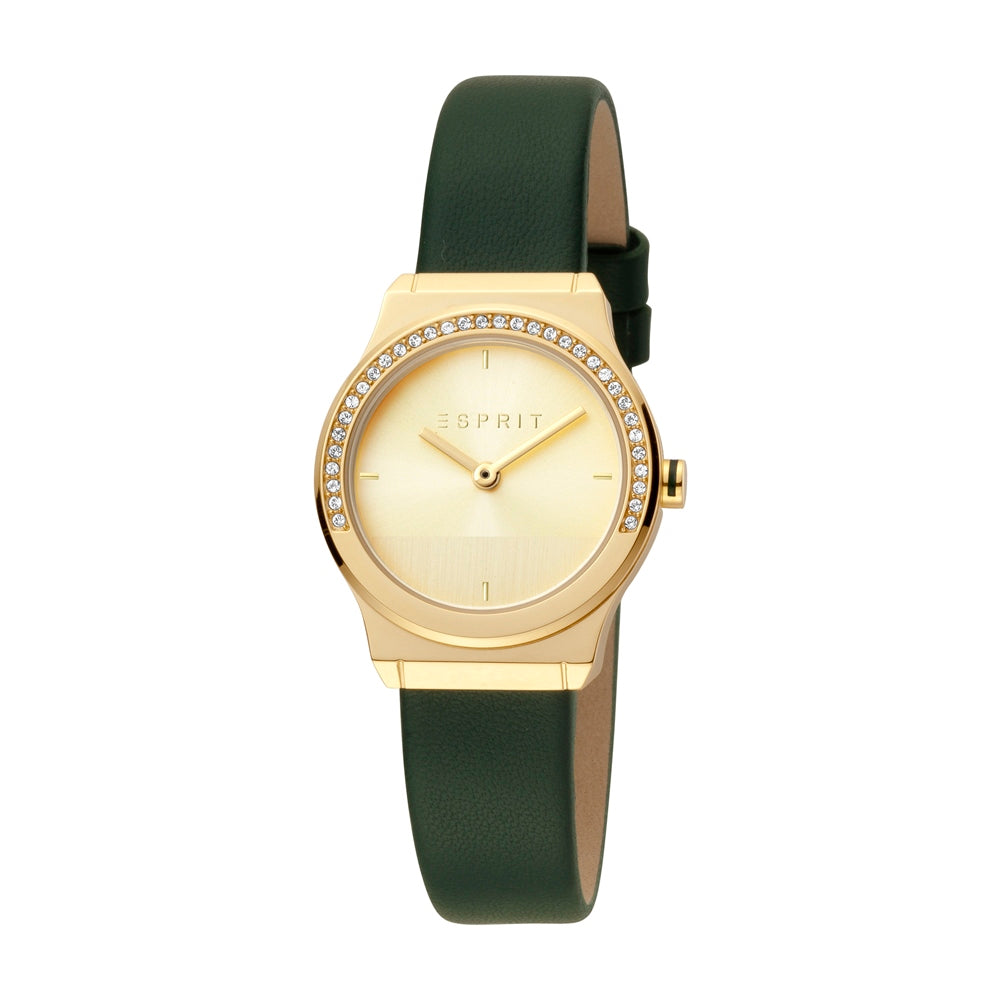ساعة إسبري نسائي من الستانلس الستيل مطلي بالذهبي مع أحجار على حواف العلبة و حزام أسود من الجلد