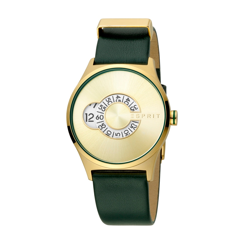 ساعة إسبري نسائي من الستانلس الستيل مطلي بالذهبي مع ميناء ذهبية اللون و حزام أسود من الجلد