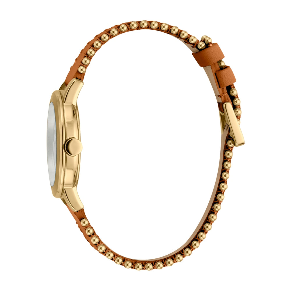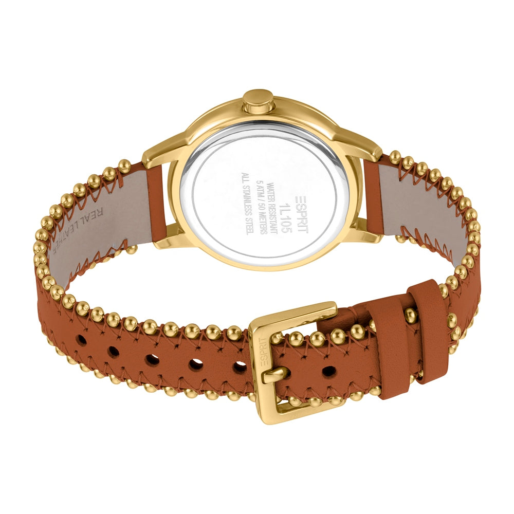 ساعة إسبري نسائي من الستانلس الستيل مطلي بالذهبي مع ميناء بيضاء و حزام من الجلد مع الخرز