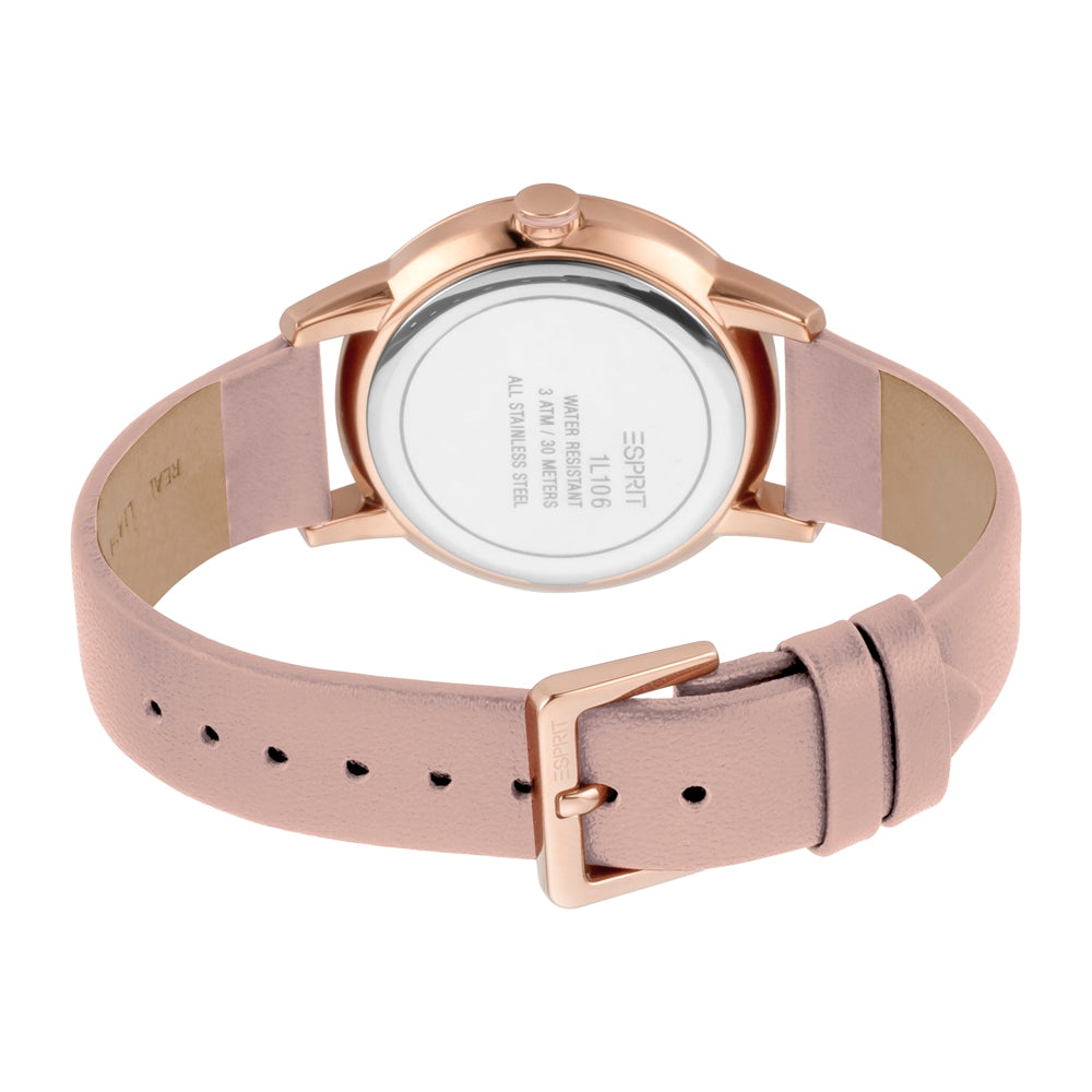 ساعة إسبري نسائي من الستانلس الستيل مطلي بالذهبي الوردي مع أحجار على حواف العلبة و ميناء فضية على حزام جلدي باللون الوردي