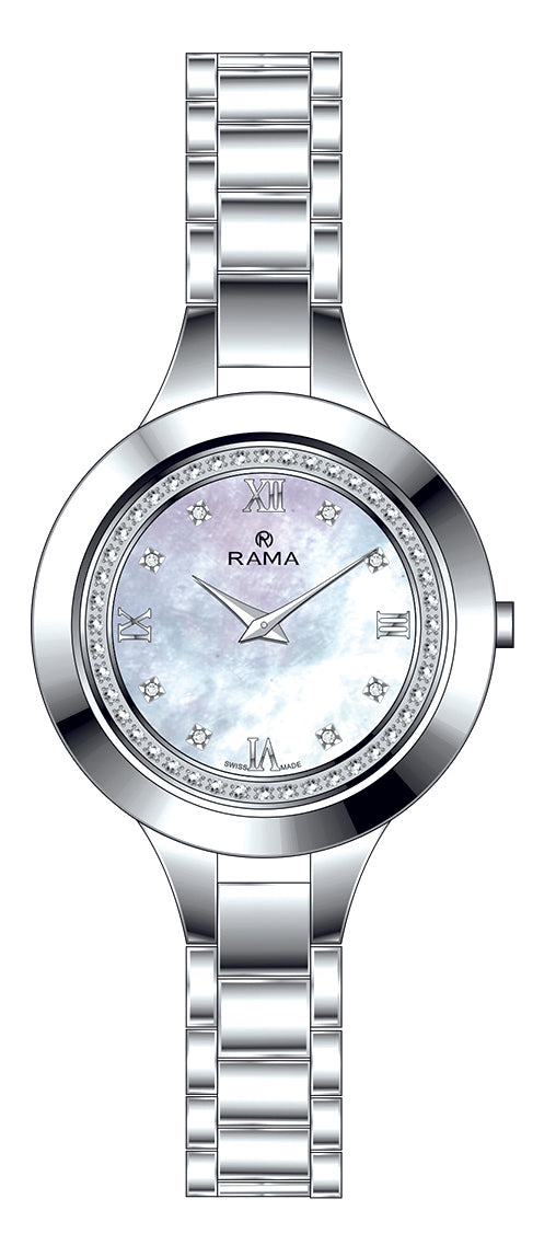ساعة راما نسائية كوارتز ذات هيكل و سوار من الستانلس ستيل مع مينا لؤلؤية بأحجار / مؤشرات أرقام مضيئة باللون الفضي/ مقاومة للماء 30 متر