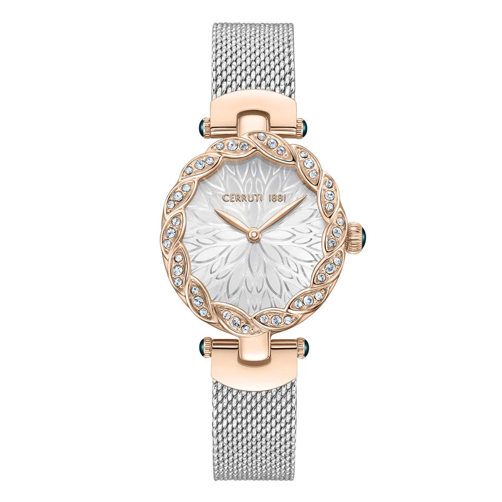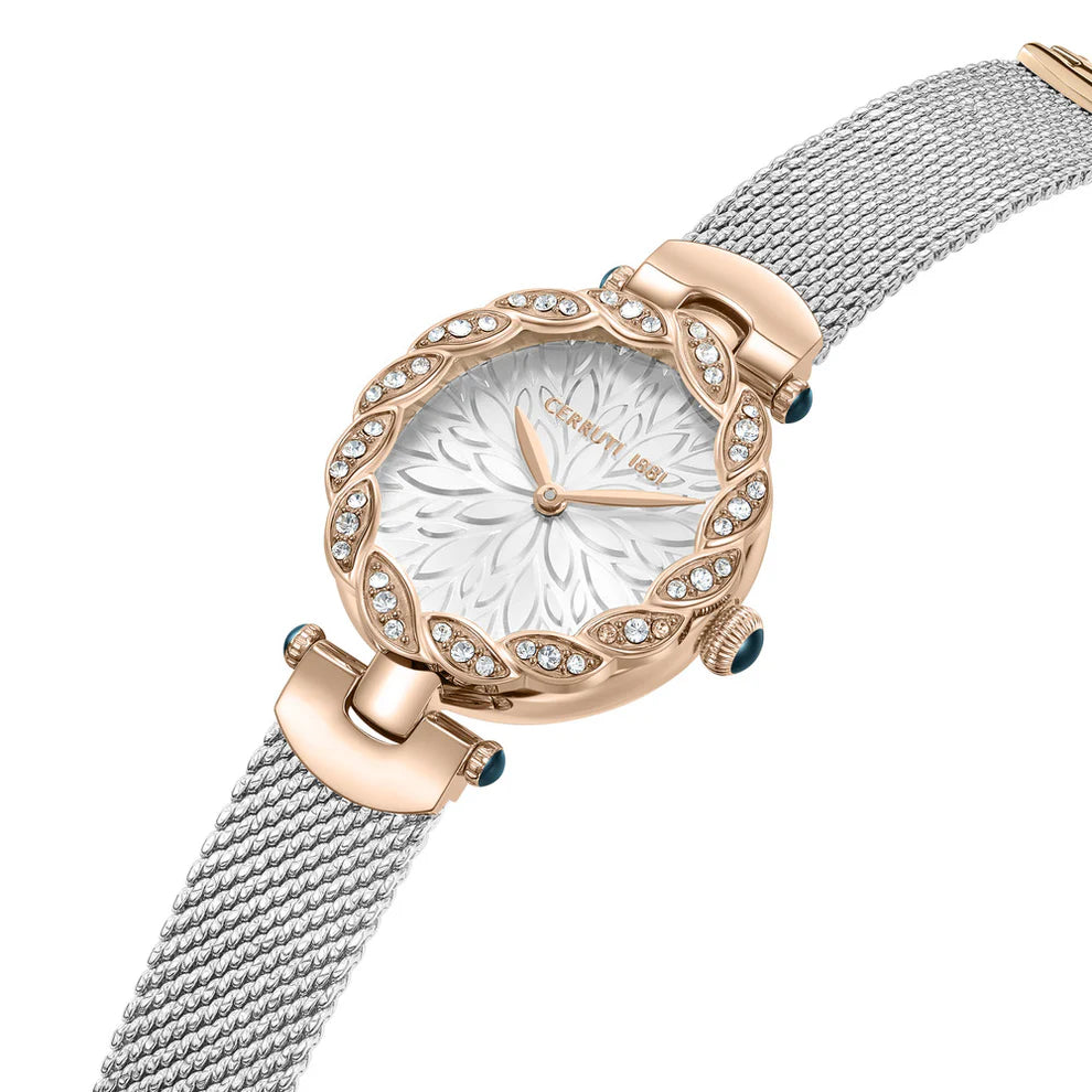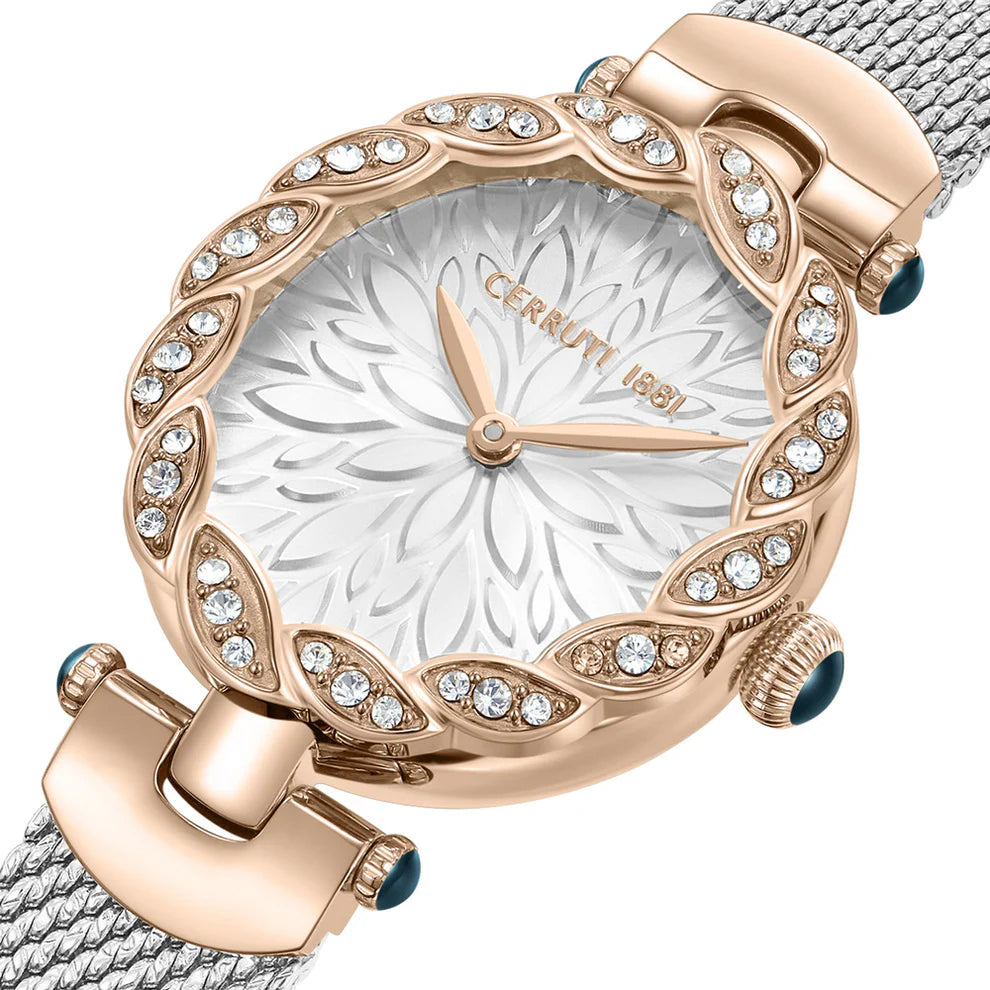 This Cerruti 1881 Nemi watch is a sophisticated and elegant timepiece for the modern woman. The watch features a white dial with a rose gold-tone case and a silver mesh strap. The dial is adorned with crystal accents and a floral pattern, adding a touch of femininity and glamour.