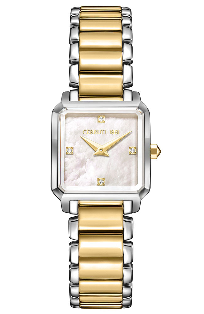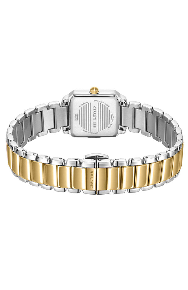 Complementing the case is a stunning two-tone bracelet, meticulously crafted from gold-plated (GP) and stainless steel links. This harmonious blend of metals creates a versatile look that transitions effortlessly from day to evening wear. The Cerruti 1881 Perugia watch is a statement of understated glamour and timeless design.