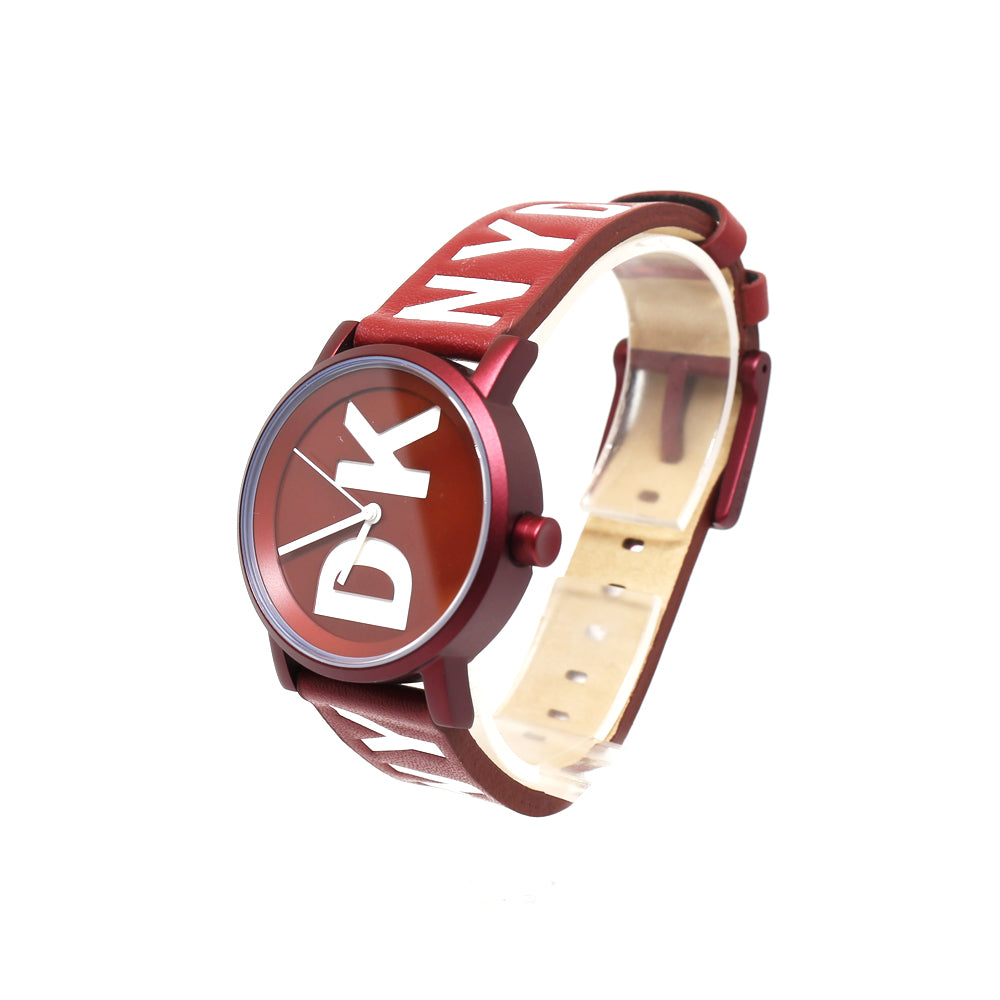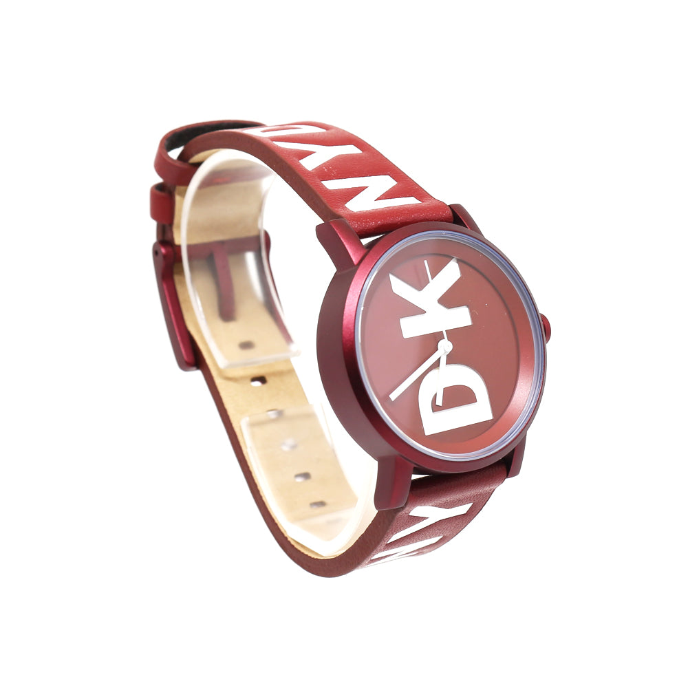 ساعة دي كاي ان واي نسائية ذات هيكل عنابي من الستانلس ستيل مع مينا و حزام جلد عنابي مع اسم العلامة باللون الابيض