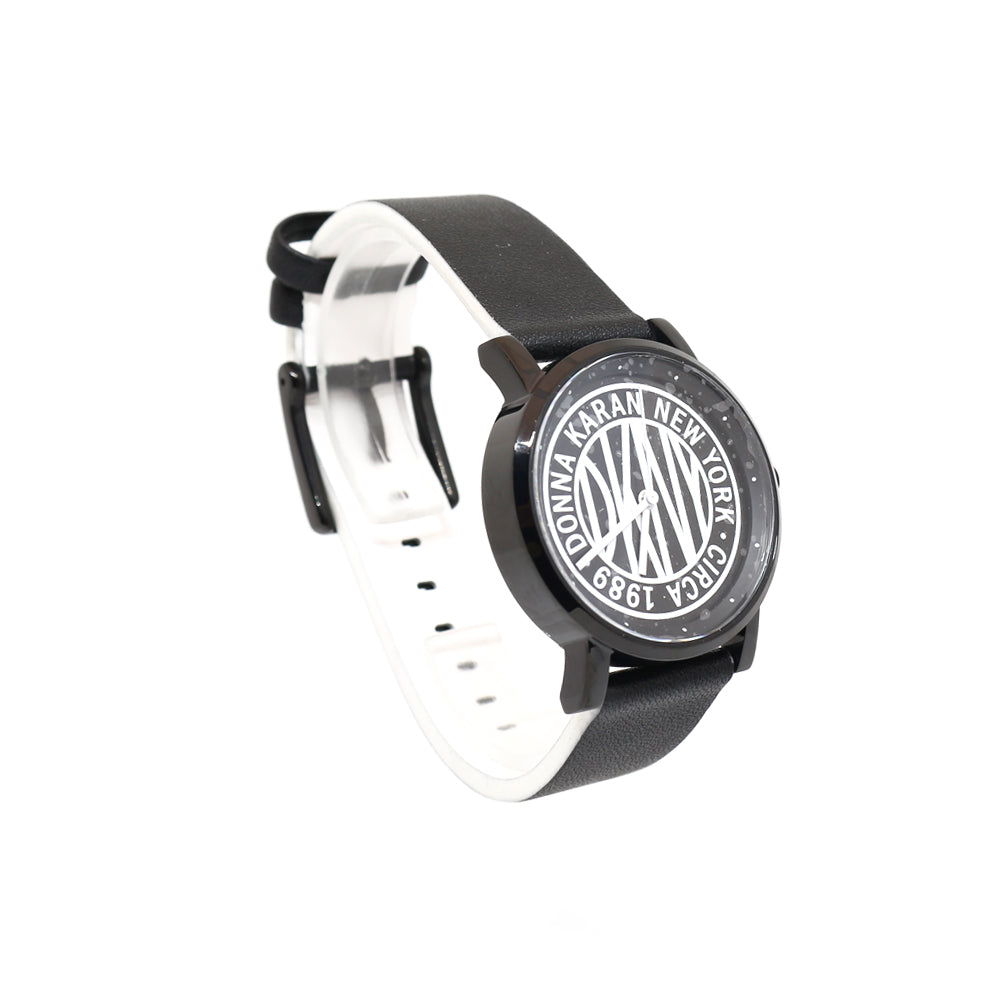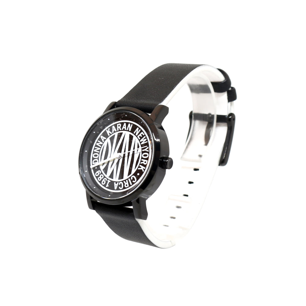 ساعة دي كاي ان واي نسائية ذات هيكل اسود من الستانلس ستسل مع مينا سوداء و بيضاء و حزام جلد اسود