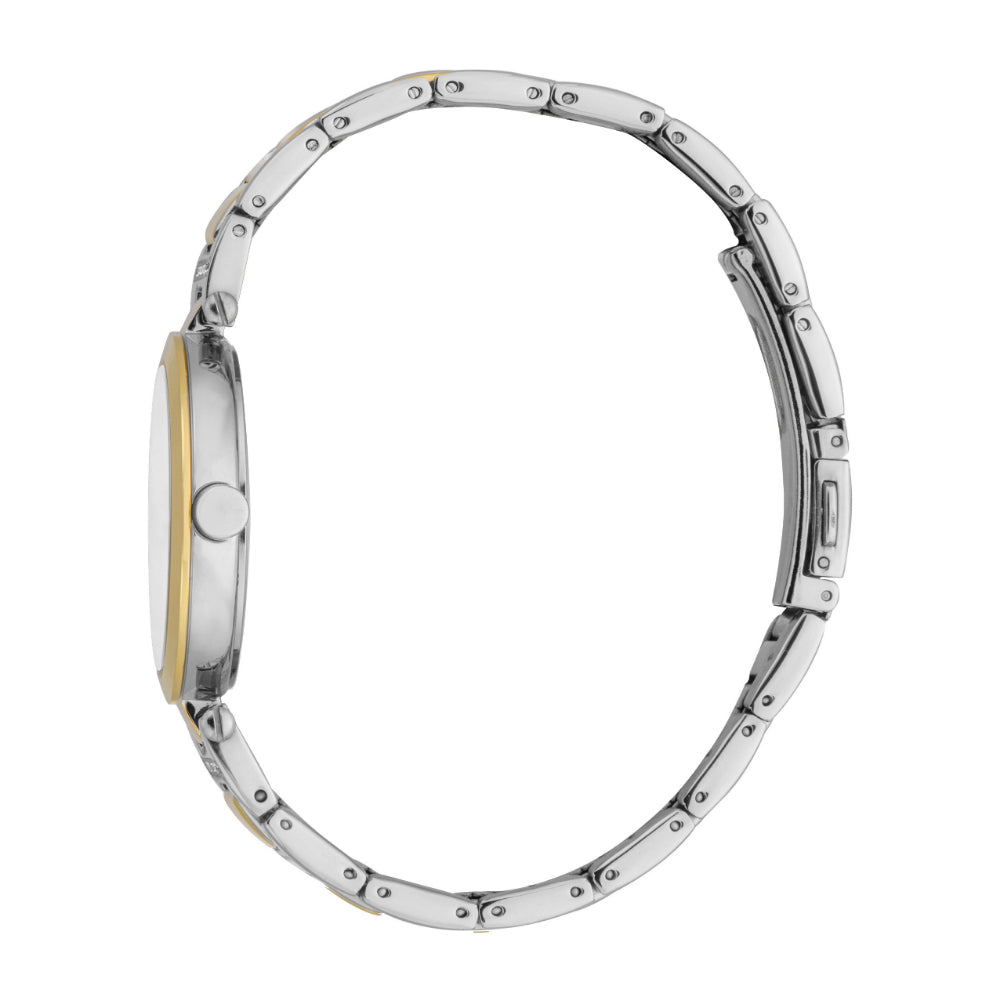 | The ESPRIT Women's two tone silver and gold color case and bracelet Watch is the perfect accessory for any woman who wants a timeless and stylish timepiece. The classic design will never go out of style, and the two tone silver and gold color case and bracelet and Silver color dial give it a modern look.Water resistance of up to 5 ATM make this watch practical and perfect for occasional swimming and other water sports. The metal bracelet is comfortable to wear all day and adds a touch of sophistication to the watch. With its timeless design and practical features, this watch is perfect for any woman who wants a stylish and versatile timepiece. SPECIFICATIONS:
