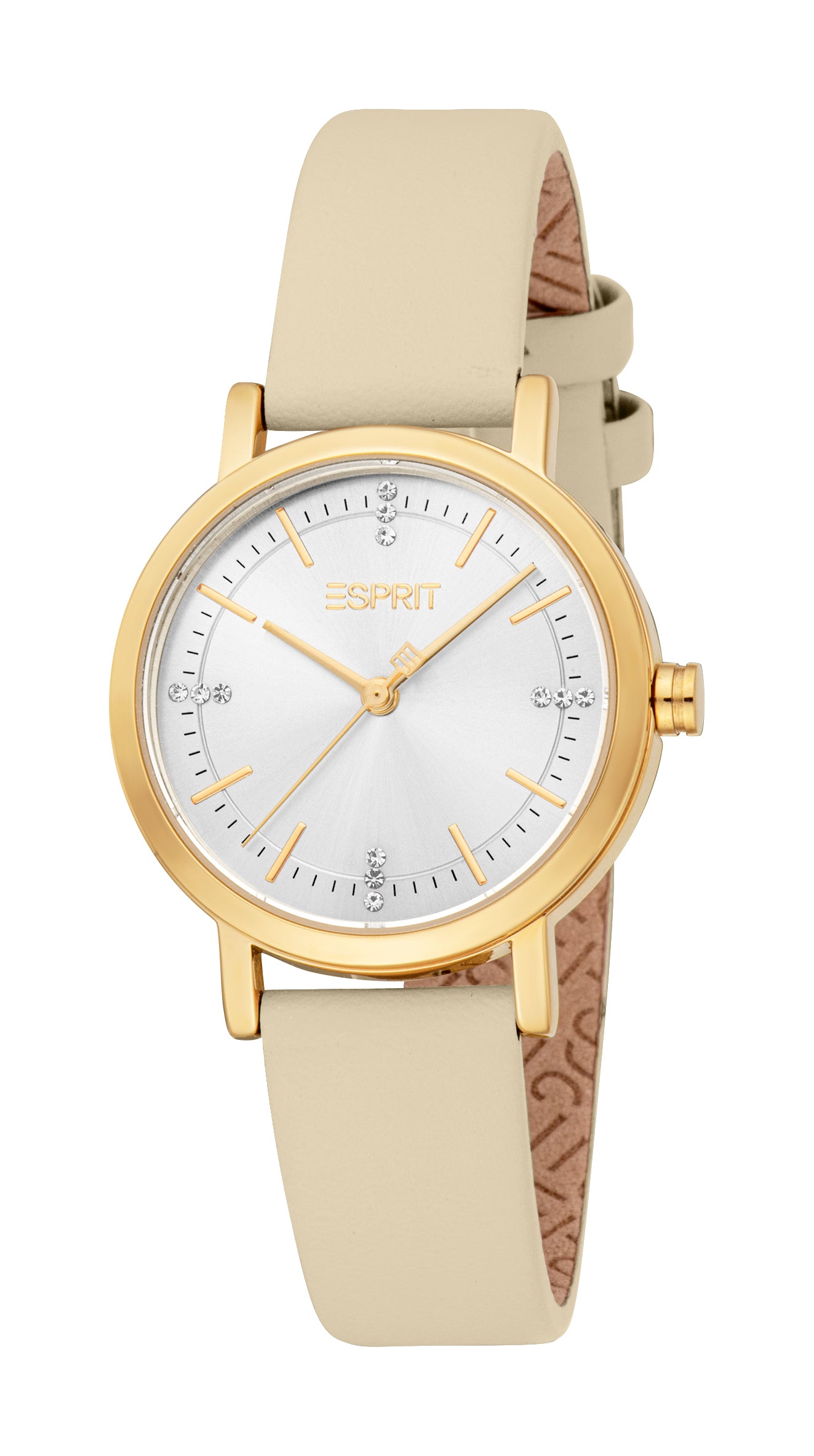 Elevate your accessory collection with the Esprit Women's Gold-Tone Watch and Bracelet Set, model ES1L463L0025. This elegant set features a sophisticated gold-tone watch with a clean silver dial accented with crystal markers. The soft beige leather strap offers comfort and style, while the matching gold-tone bracelet with delicate crystal drops adds a touch of sparkle. Perfect for everyday wear or special occasions, this set will enhance any outfit. The watch is also water-resistant to 3ATM, protecting it from splashes and minor water exposure.