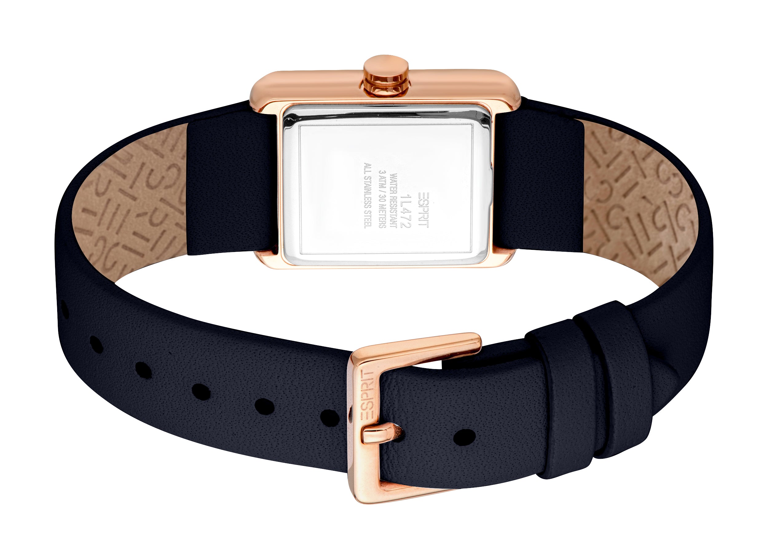 Esprit Women’s Rectangular Rose Gold Watch – Blue Leather Strap 3ATM