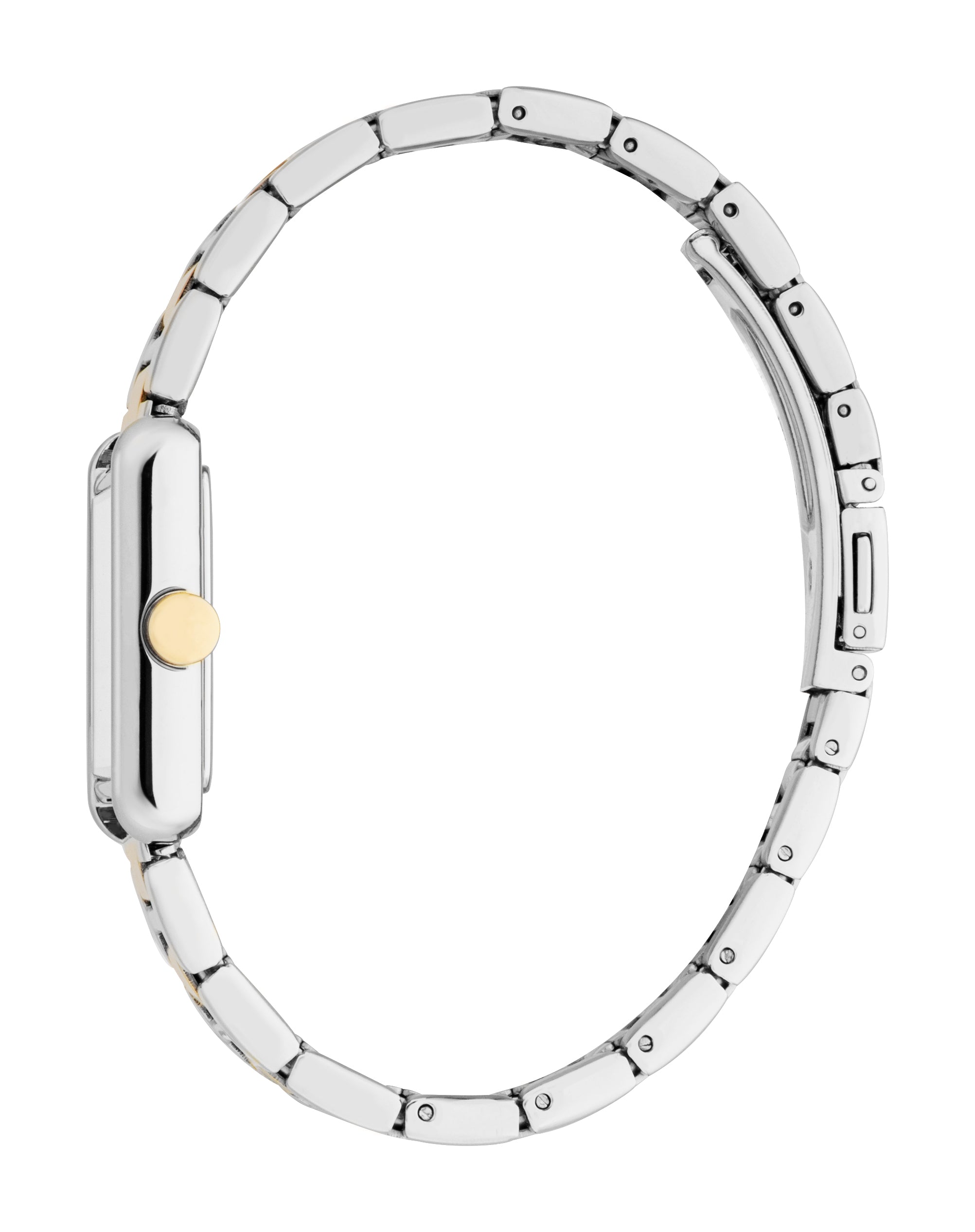 Design: The watch features a polished two-tone case and bracelet, combining silver-toned links with bold gold-toned accents. The rectangular case houses a clean white dial with a striking inner rectangle, Roman numeral XII and VI, and sleek indices.