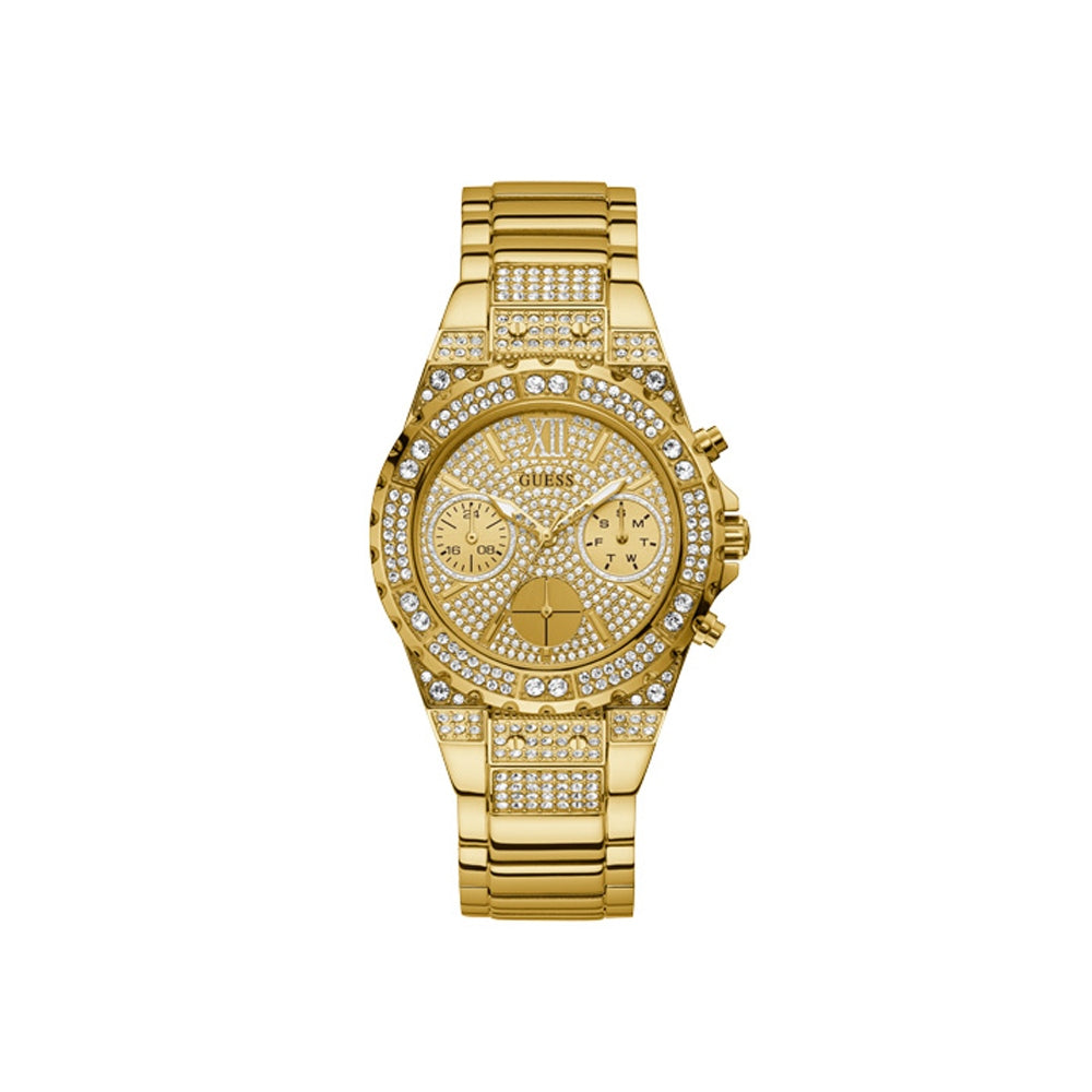 ساعة جيس ذهبية اللون مرصعة بالكريستال مع مينا صفراء لماعة و سوار ذهبي بالأحجار