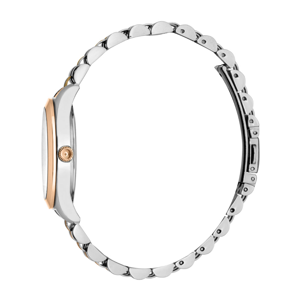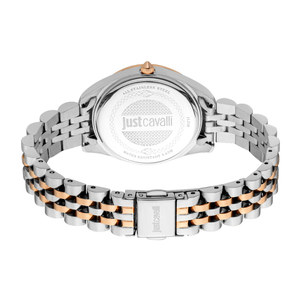 Elevate your style with this elegant and versatile Just Cavalli women's watch. Featuring a two-tone silver and rose gold color case and bracelet, this watch is designed to complement any outfit. The silver dial provides a sleek and sophisticated look, while the two-tone silver and rose gold color metal bracelet adds a touch of luxury. With 3 hands and a water resistance of 5 ATM, this watch is not only stylish but also functional.
