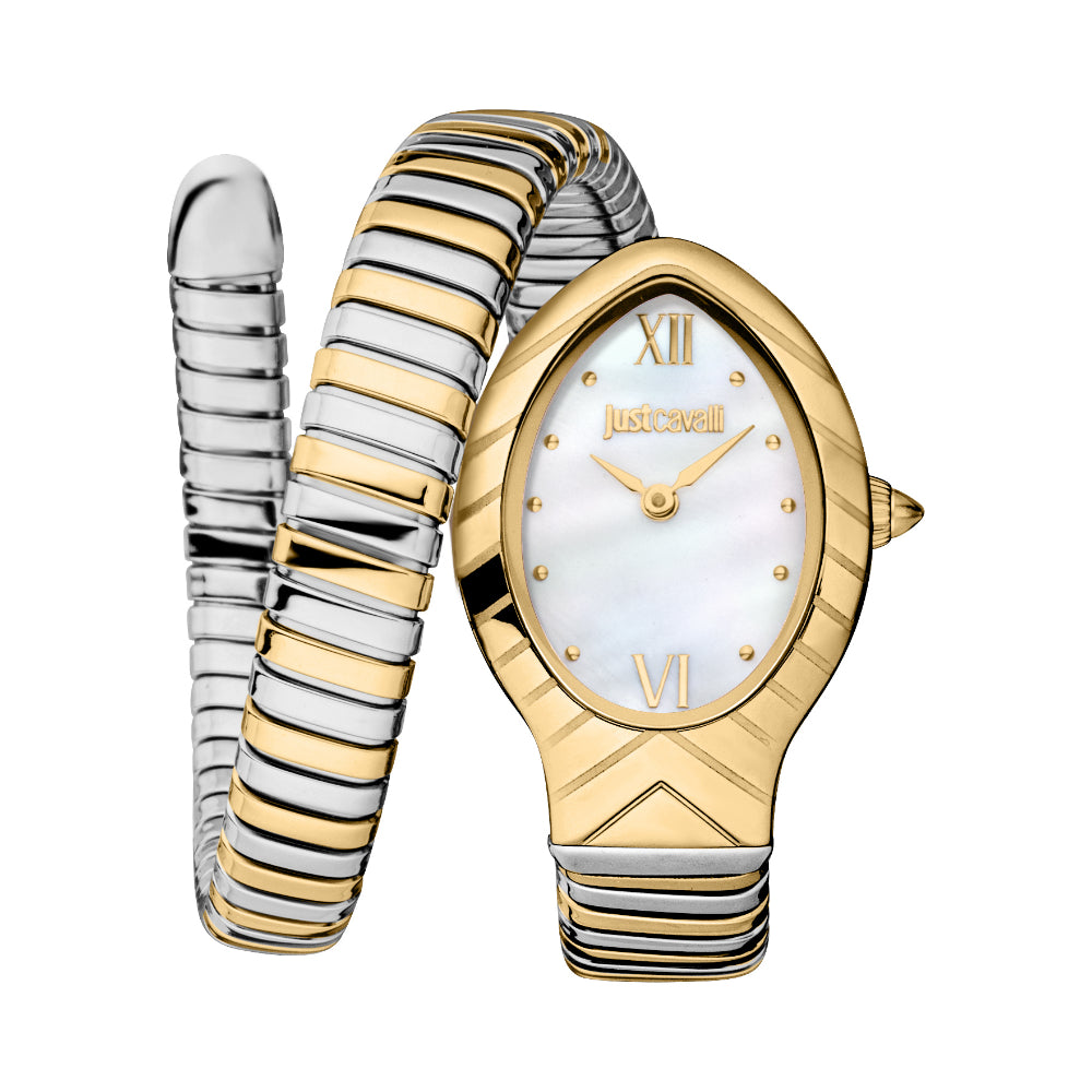 Just Cavalli Snake Shape Women's Watch - Gold Color Case, White MOP Dial, Two Tone Silver & Gold Color Bracelet