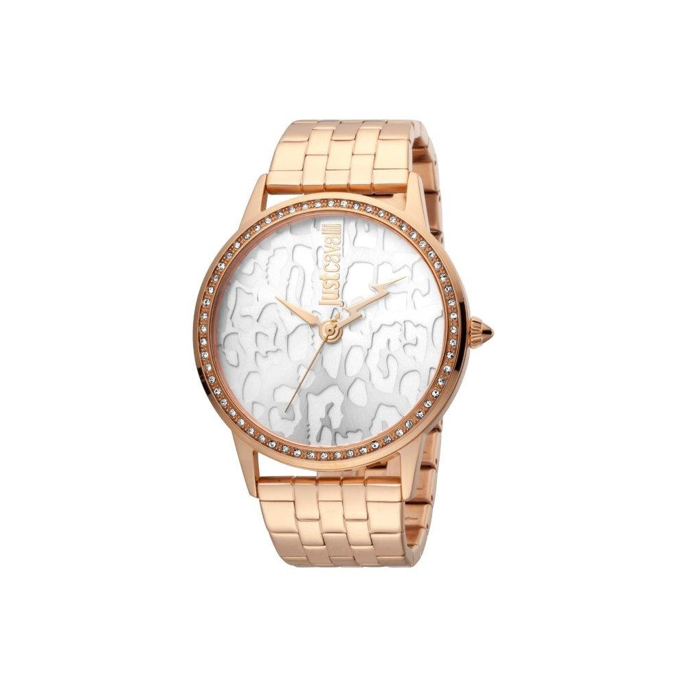 ساعة جست كافالي نسائية ذات هيكل بلون ذهبي وردي، من الستانليس ستيل مع مينا فضية مزركشة وسوار بلون ذهبي وردي، من الستانليس ستيل