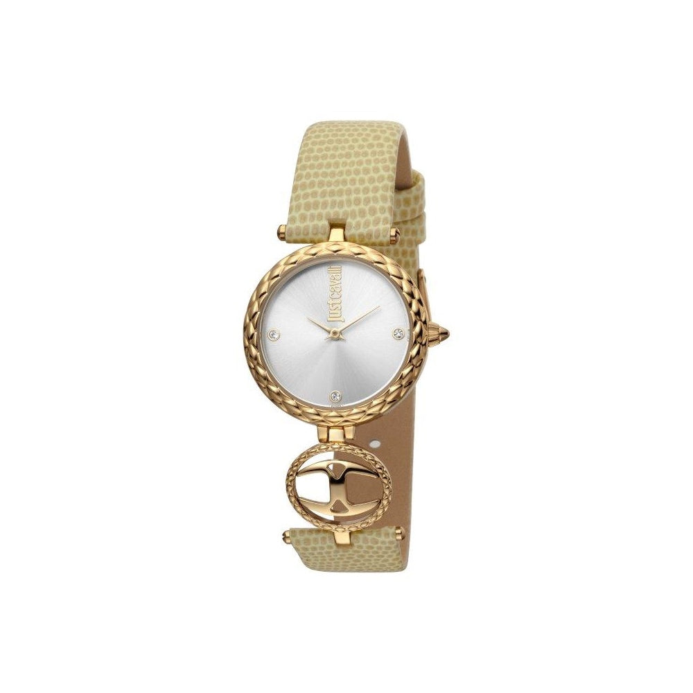 ساعة جست كافالي نسائية ذات هيكل ذهبي من الستانليس ستيل مع مينا ذهبية وحزام جلدي بيج طقم مع اسوار