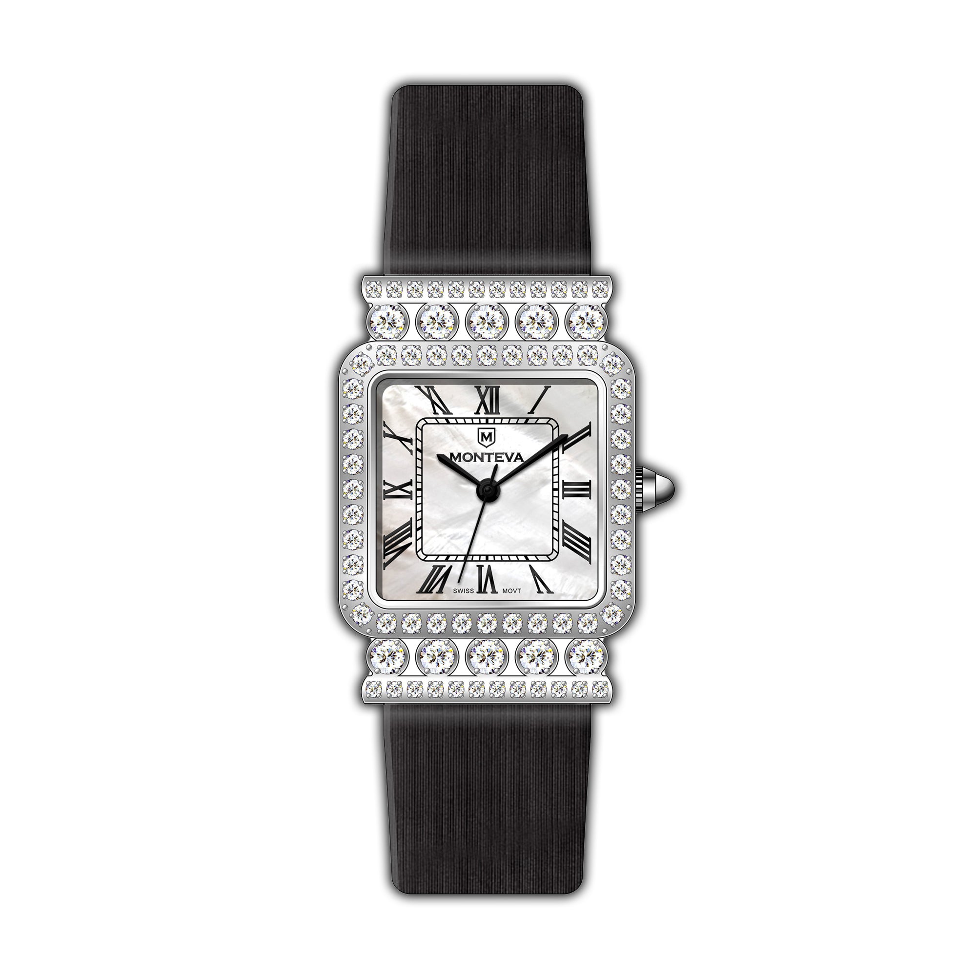 Monteva Ladies Silver-Tone - Stones Bezel, MOP Roman Dial, Black Leather Strap Watch