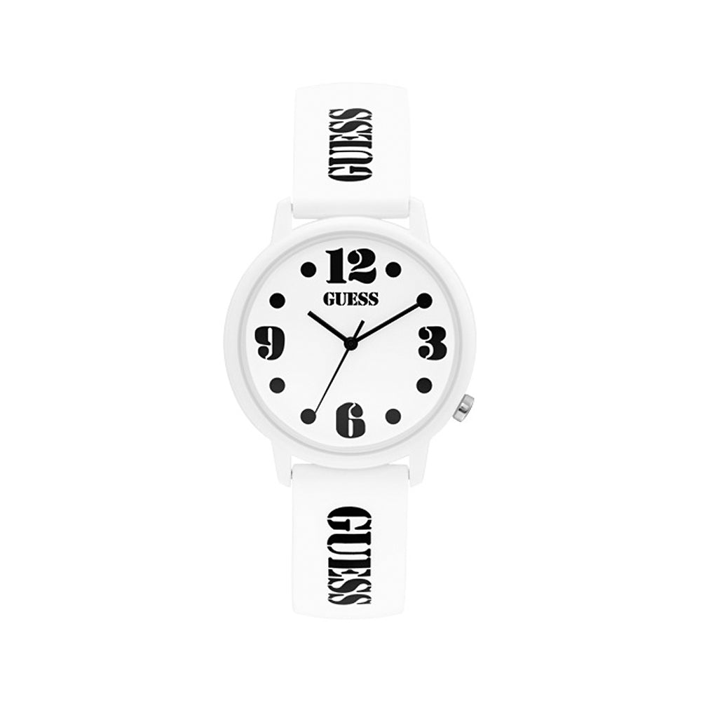 ساعة جيس ذات هيكل أبيض من البلاستيك و مينا بيضاء مع حزام من السليكون الأبيض عليه شعار العلامة باللون الأسود /مقاومة للماء