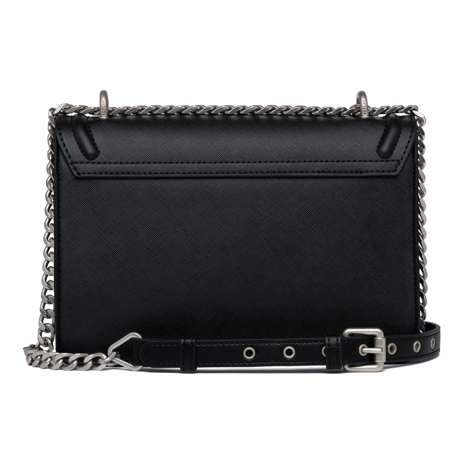 The Replay Women's Leather Black Bag is both stylish and functional. Made from high-quality leather, this crossbody bag features a saffiano effect that adds texture and sophistication. The metal chain strap is adjustable, allowing you to wear it as a crossbody or on your shoulder. The bag also comes with a fringe metal pendant and a customized plate that can be hooked on with a snap-hook. The fastening flap is adorned with REPLAY writing in metal, adding a touch of glamour to the bag. With a width of 6 cm, height of 13.5 cm, and length of 18.5 cm, this bag is spacious enough to fit all of your daily essentials while still being compact enough to carry around easily. It's the perfect accessory to elevate your outfit. SPECIFICATIONS