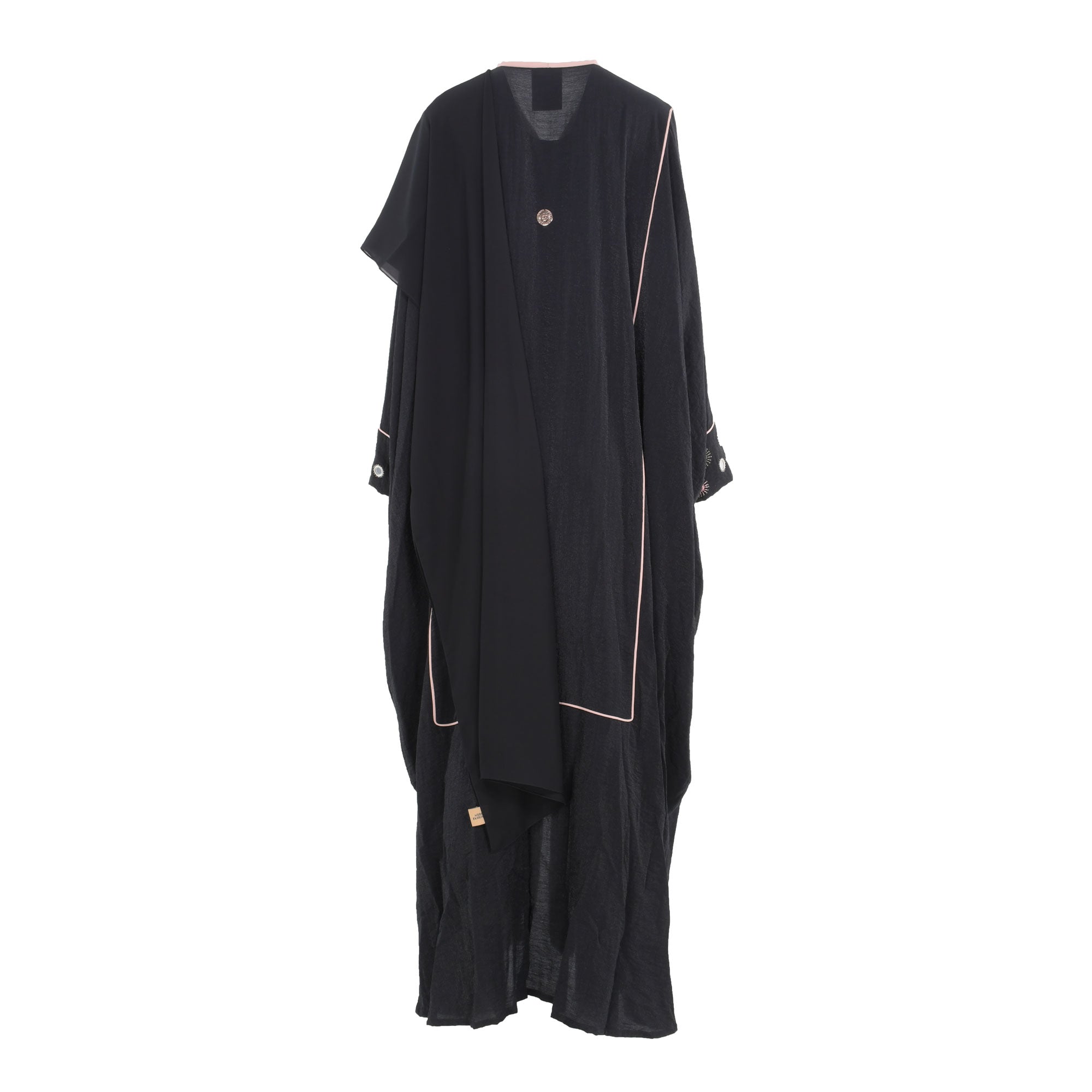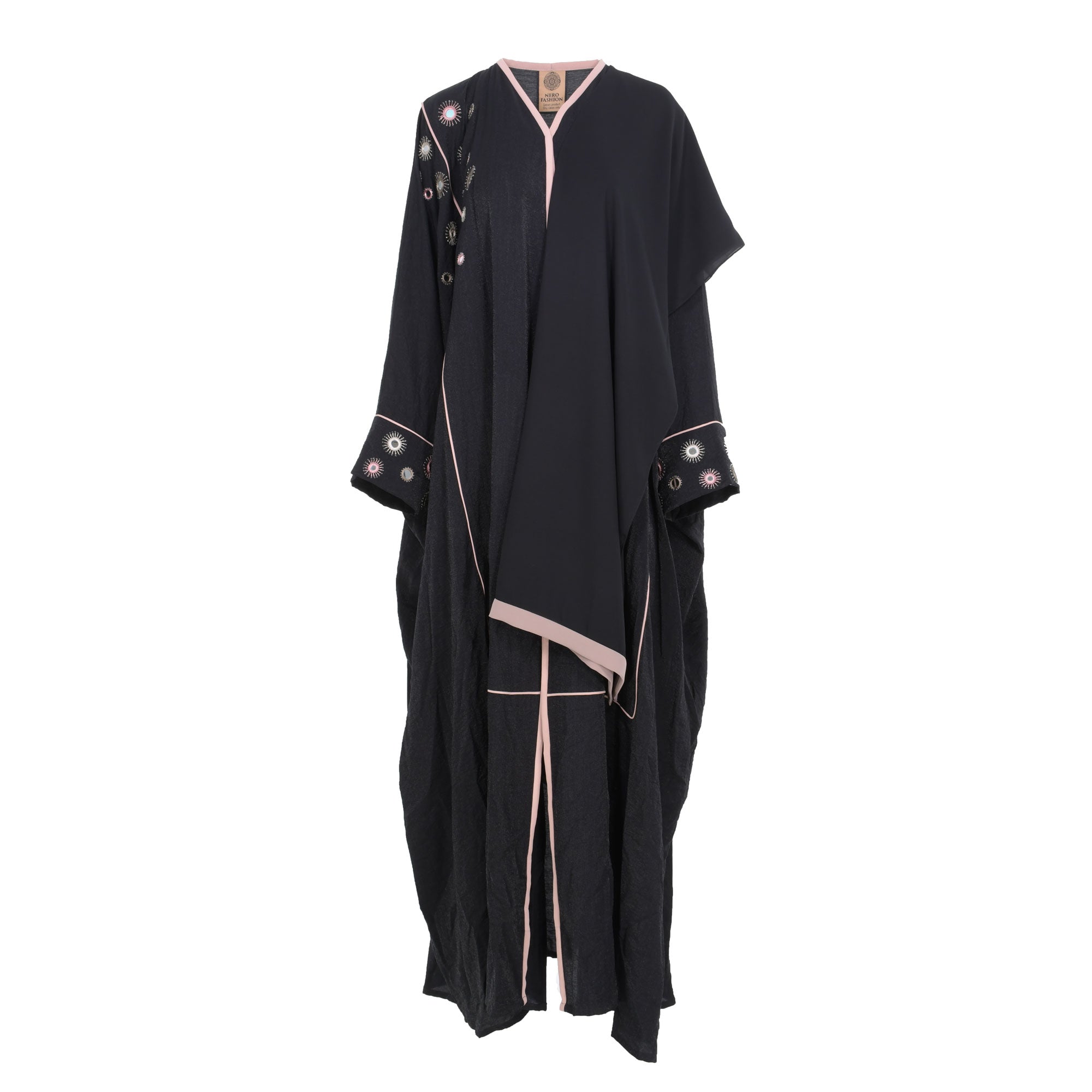 The Nero Fashion Black and pink Abaya is the perfect way to make a fashion statement this season. This stylish abaya features a large size fit with long, loose sleeves and v neck style with pink pipeline on the edges of sleeves and front and back . The abaya is embellished with beautiful mirror and thread embroidery design  to the shoulder and sleeves which adds a unique touch. The snap buttons at the front make it convenient to style this as both an Open Abaya Robe, and a Closed Abaya Look . This abaya is perfect for any occasion, from formal events to casual days out. Not only is it comfortable and stylish, but it also makes a great statement piece that will turn heads wherever you go.