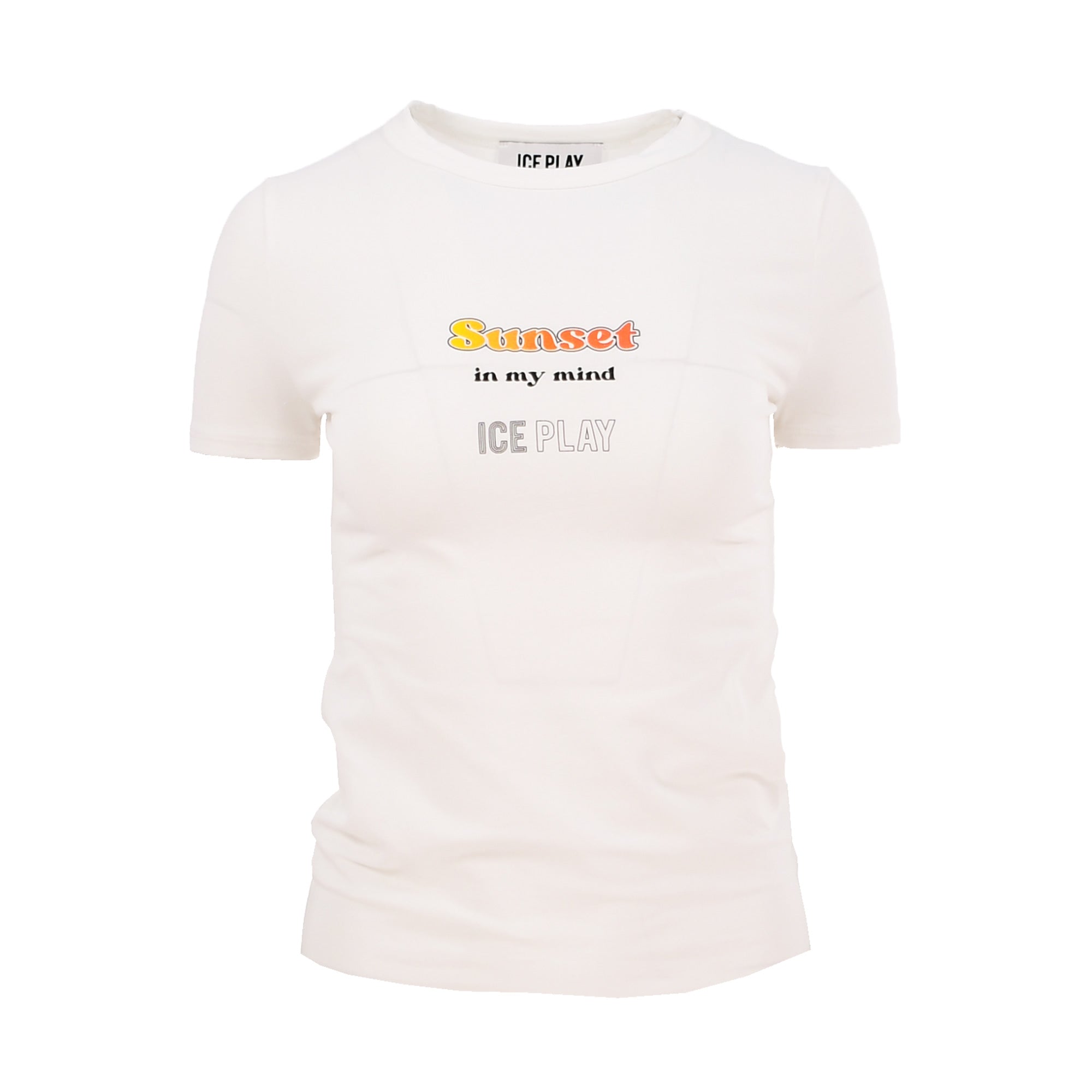This Ice Play brand Logo Print T-shirt in White is made from cotton and features a short sleeve design, a crew neck, and a multicolor brand logo print at the front of the shirt. It is available in sizes small to large.