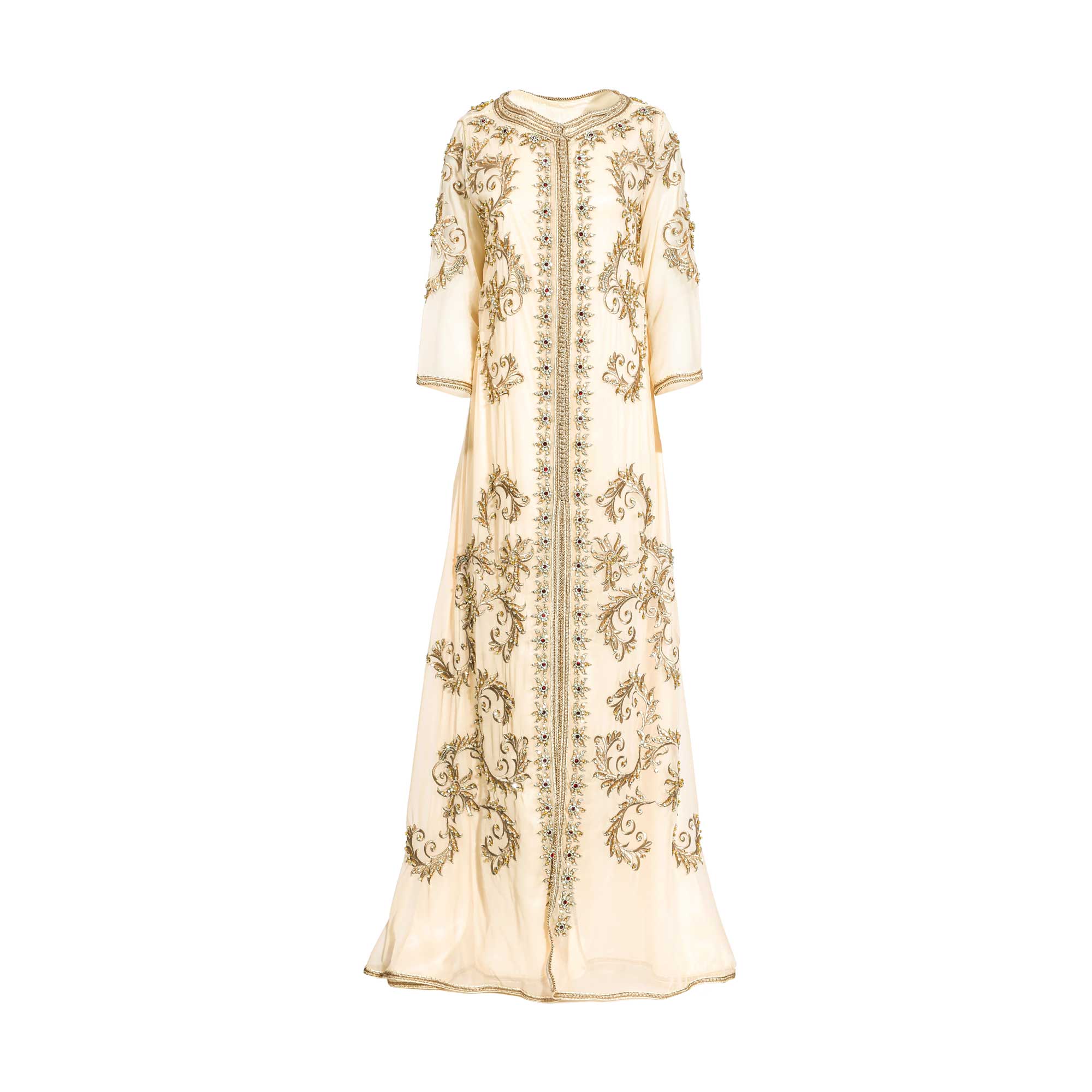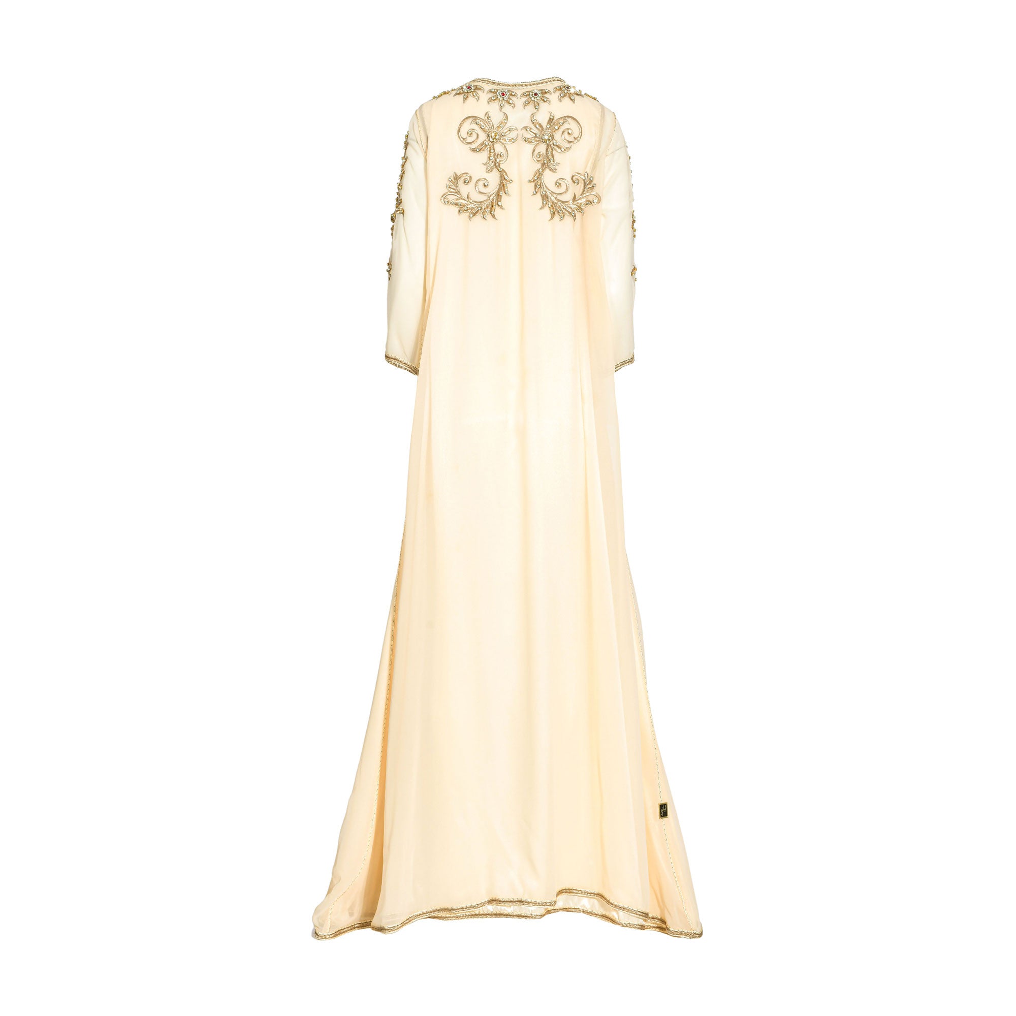 This Laylati Women's Off-white kaftan is a timeless and elegant piece. It is crafted from a fine fabric and features golden hand embroidery to the front, back and sleeves. The kaftan is trimmed with golden lace on the neck, front, hemline and sleeves and has long sleeves and a full length. The off-white color is timeless and versatile, and makes this kaftan perfect for formal occasions, special events, or simply as an everyday statement piece. The intricate embroidery and lace detailing elevates the classic design, making it a beautiful addition to any wardrobe. This kaftan comes in a free size, making it a great option for all body types.