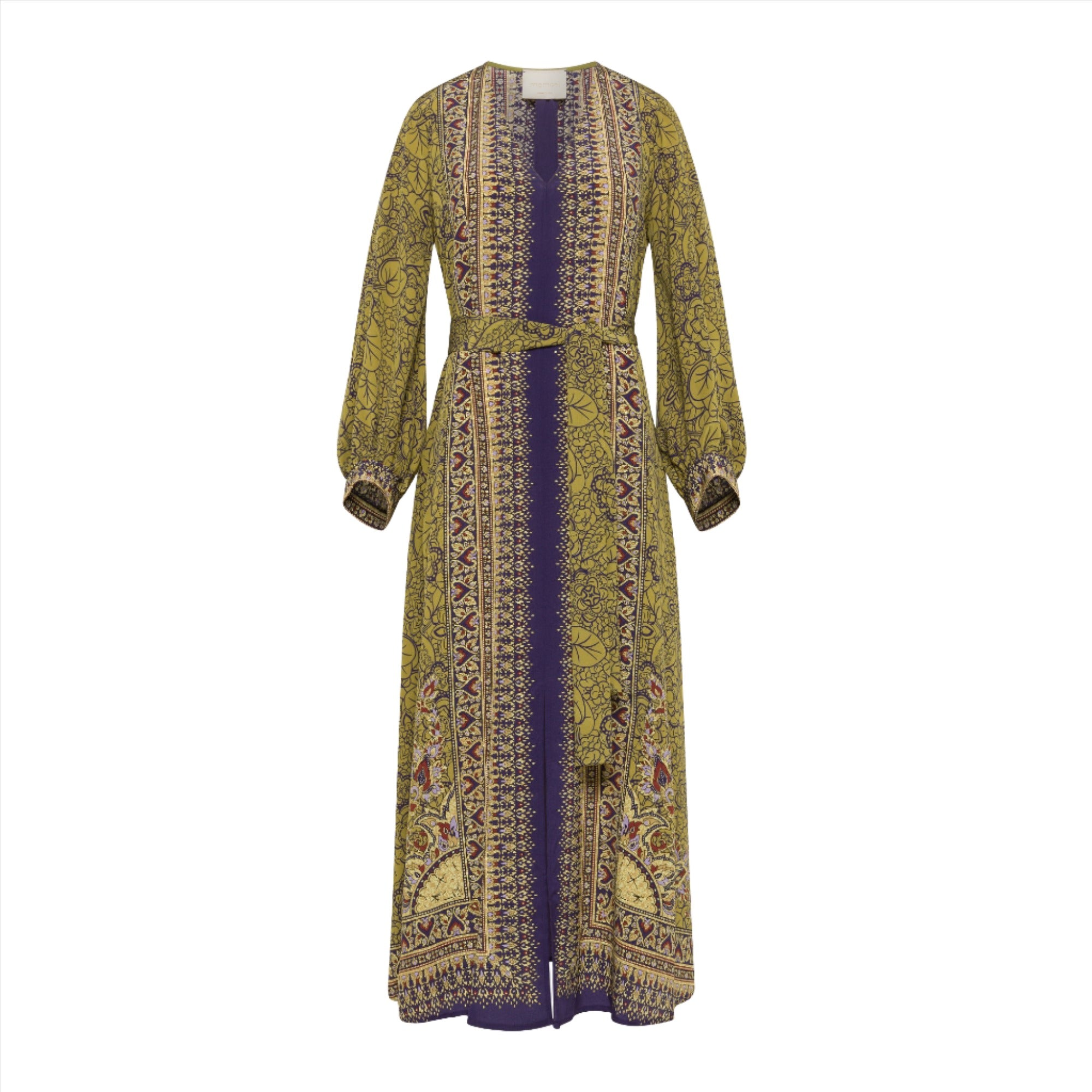 - Feminine ankle length dress with front slit. Full sleeves gathered into a band cuff complete Adelma's airy look.
