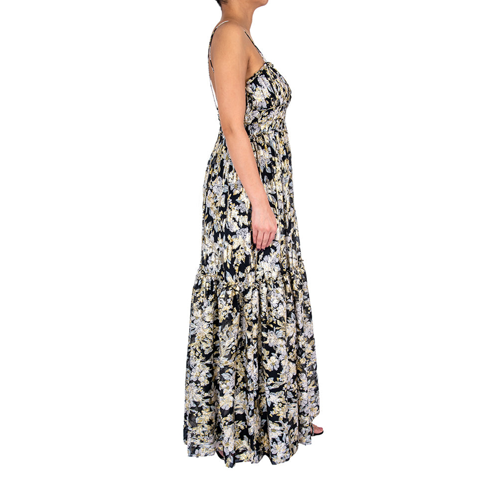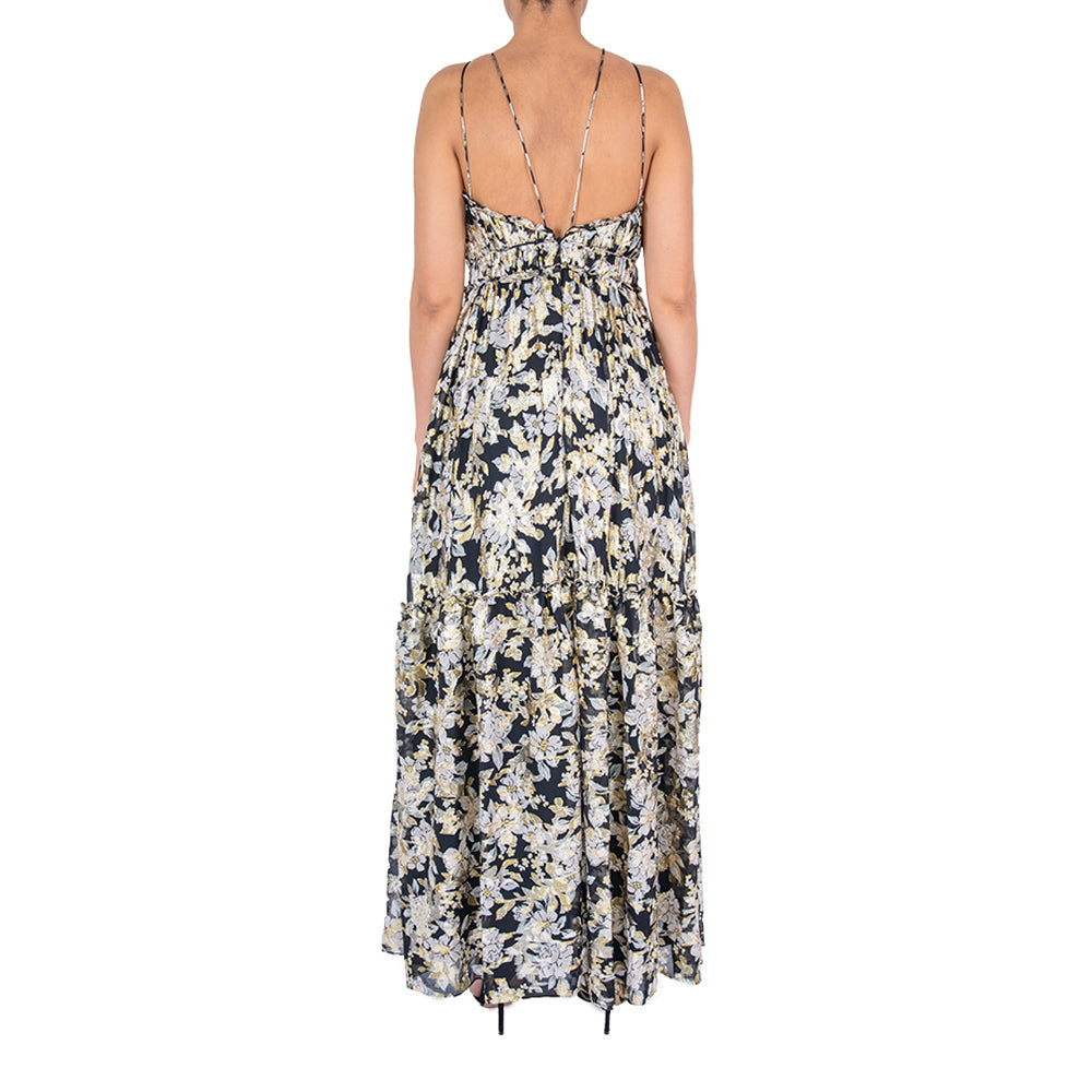 Crafted of chiffon, this maxi dress is decorated with colorful metallic designs and a tiered skirt.