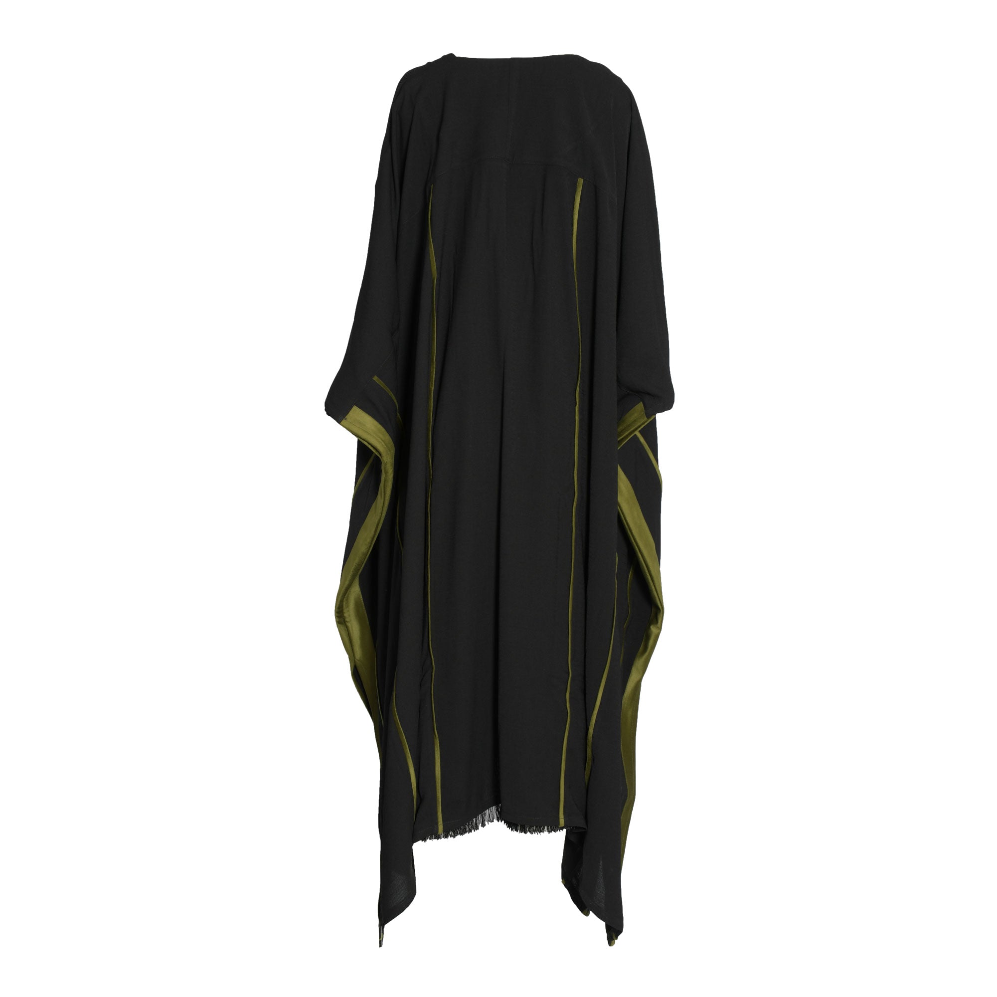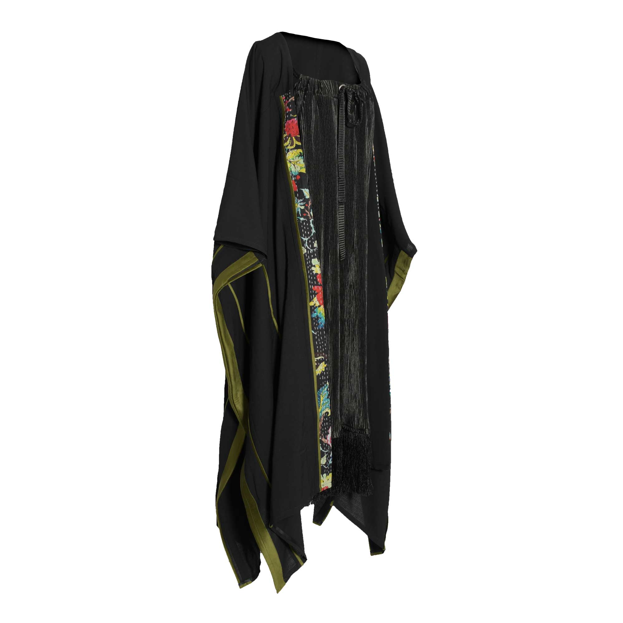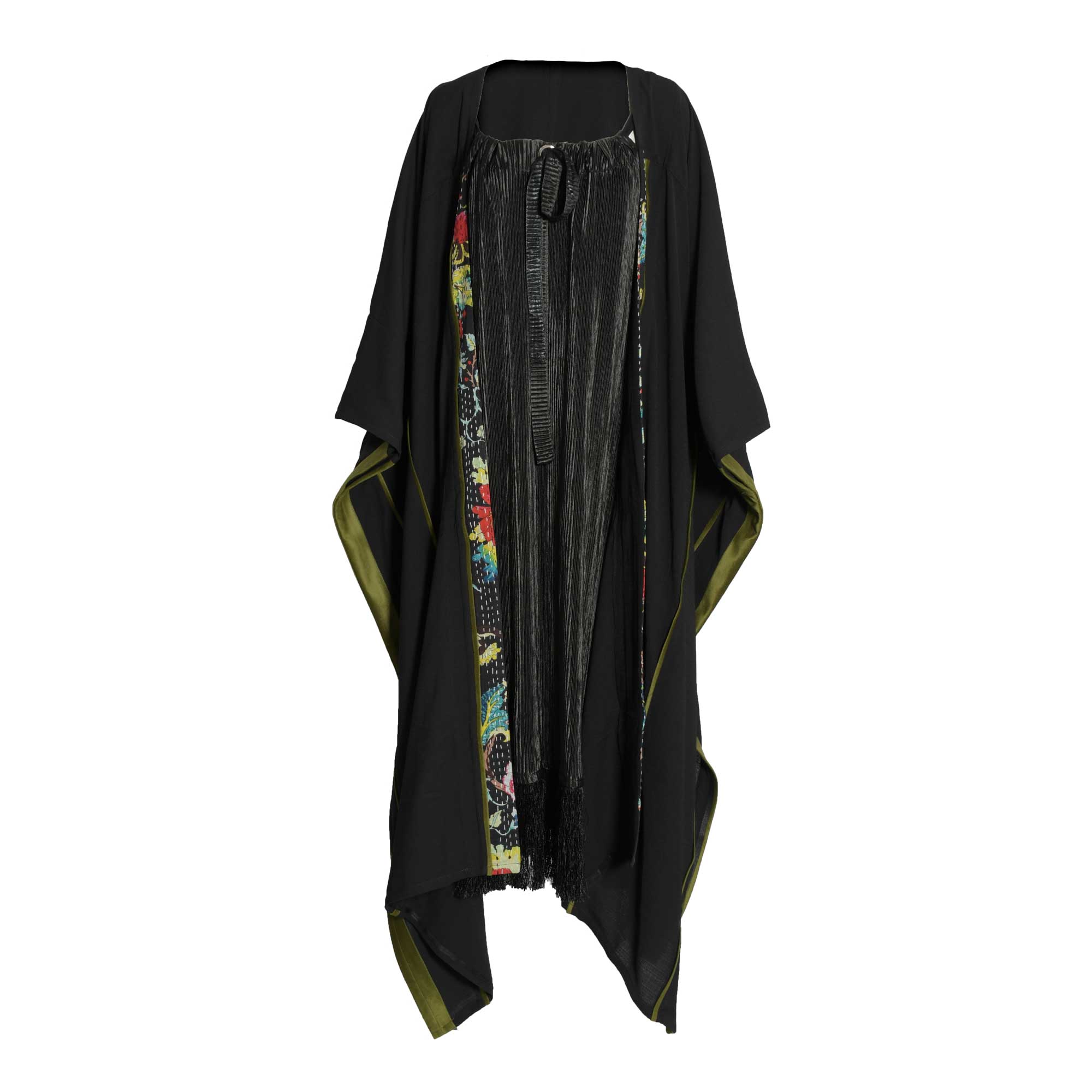 | This Fahm Dress & Abaya Set is the perfect combination of style and comfort. The interior has black free size dress is simple yet elegant, with a round neck with drawstring, sleeveless and wrinkled fabric with fringe detail at bottom. The exterior is a long loose sleeves abaya with a front open and long loose sleeves adorned with kaftan style, floral pattern on front and trim with contrast pipeline. It also features slits on both sides, making it easy to move around in. The fine fabric ensures a comfortable and breathable fit all day long. Whether you're attending a special occasion or just want to look stylish, this set is sure to turn heads. SPECIFICATIONS: