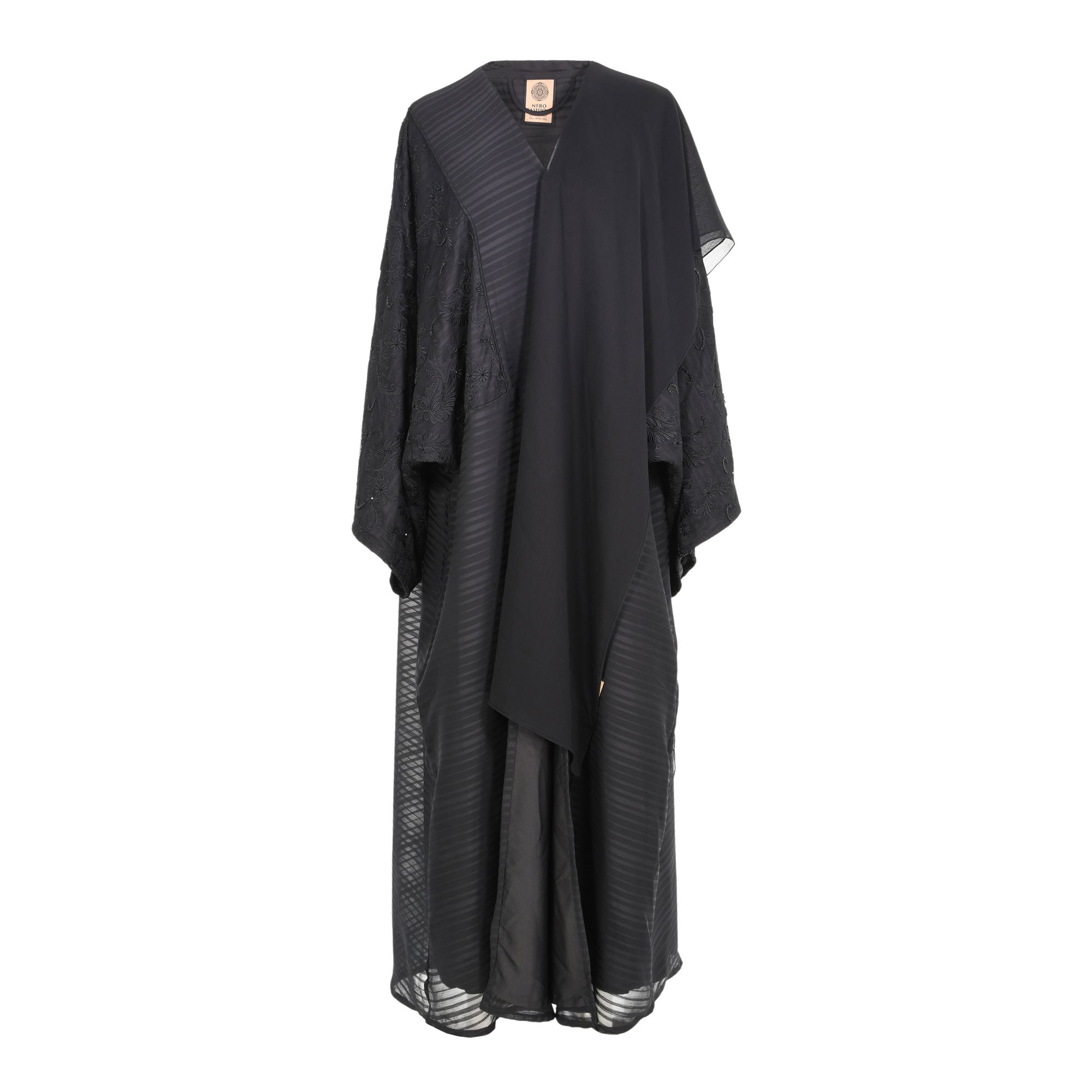 The Nero Fashion Black layered Abaya is the perfect way to make a fashion statement this season. This stylish abaya features a large size fit with long, loose sleeves and v neck style. The abaya is embellished with beautiful sequins embroidery design  to the front and sleeves which adds a unique touch. The snap buttons at the front make it convenient to style this as both an Open Abaya Robe, and a Closed Abaya Look . This abaya is perfect for any occasion, from formal events to casual days out. Not only is it comfortable and stylish, but it also makes a great statement piece that will turn heads wherever you go.