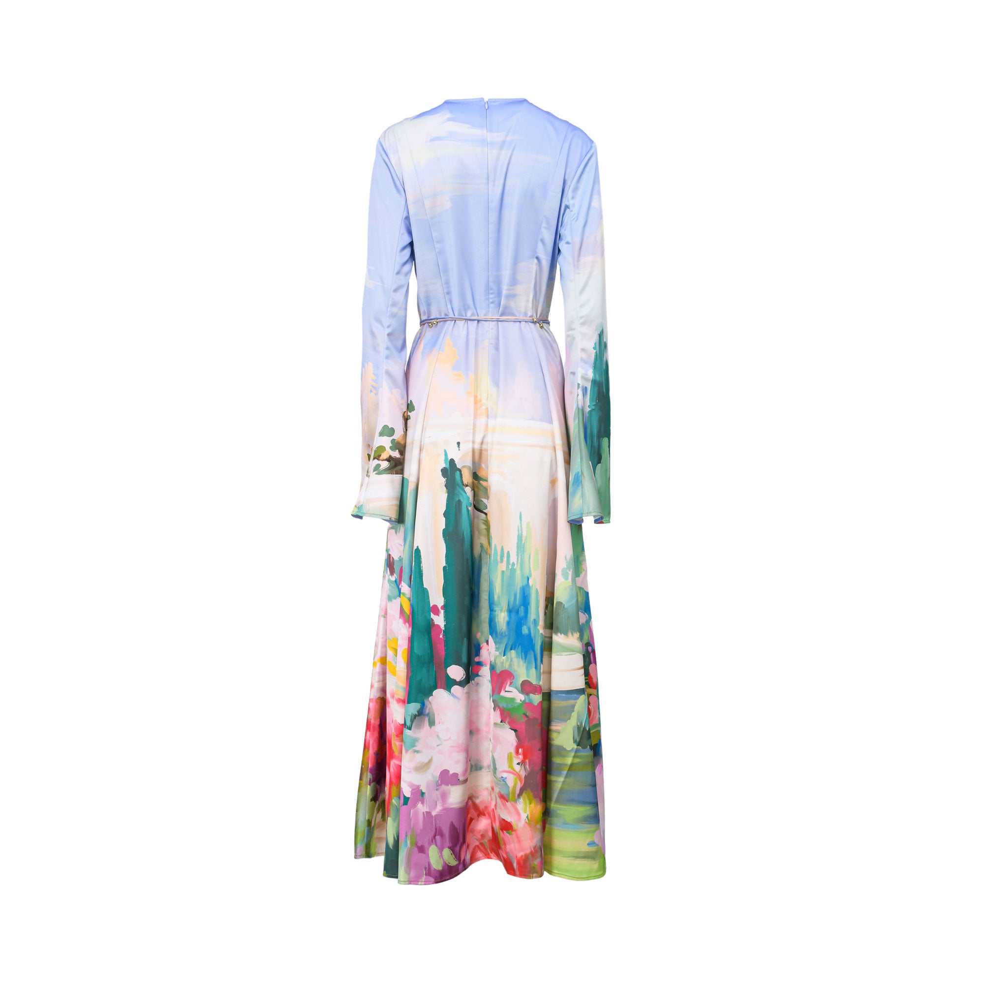 Step into the timeless beauty of the LEO LIN Francesca Maxi Dress in Jardin Print, reminiscent of the enchanting Garden of Versailles. This exquisite dress features a delicate rose garden design rendered in soft pastels, with captivating flashes of scarlet and violet, bringing a touch of romantic artistry to your wardrobe.