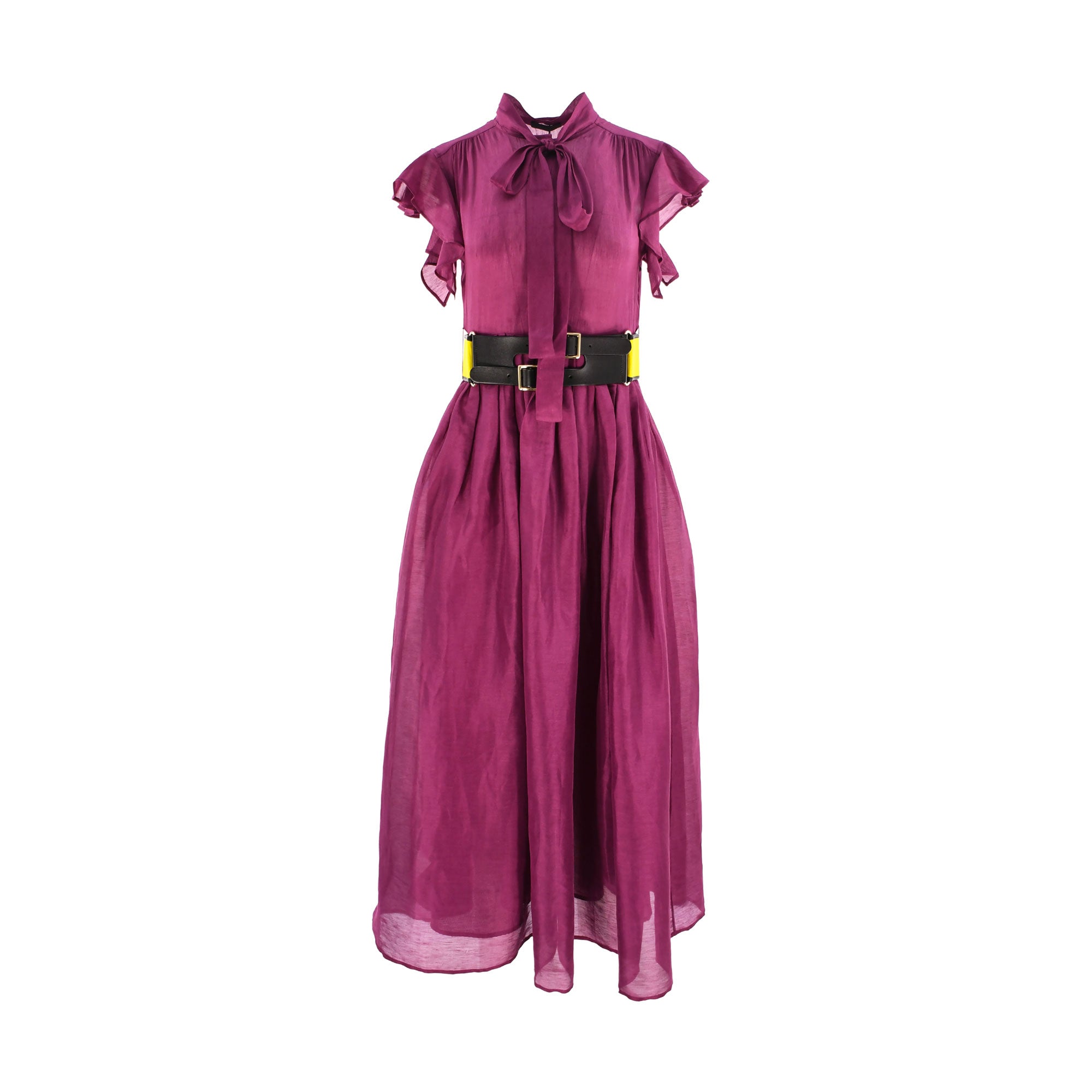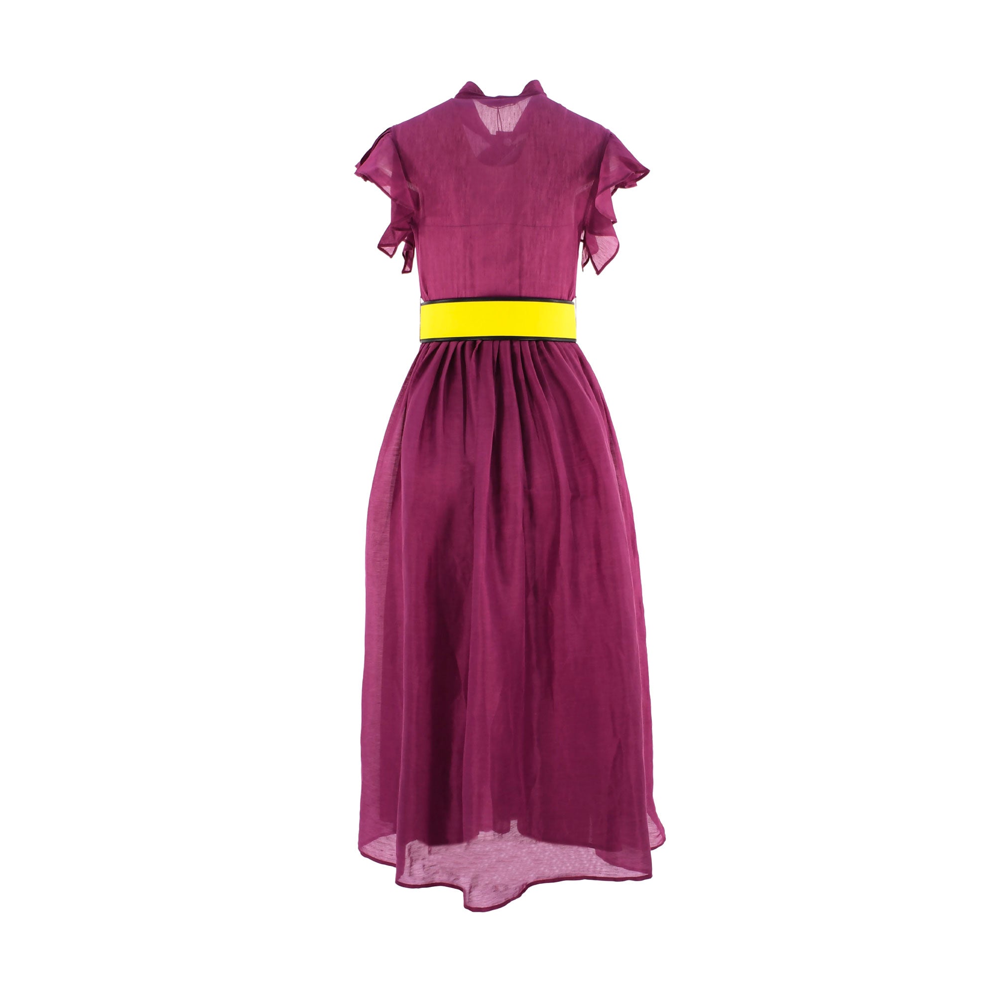 | The LEO LIN Fauves Flutter Sleeve Dress exudes a sophisticated and romantic energy. The matching belt emphasizes the fitted waist as well as the dress's uniqueness and fluidity. High neckline with fabric tie- Semi-sheer top- Hidden button placket- Fluted short sleeves- Fully lined gathered midi length skirt- Invisible side zip closure- Cami slip top included- Matching belt included. SPECIFICATION :